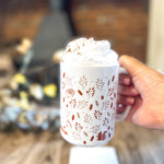 - Our hand drawn Woodlands design in a seamless pattern around the entirety of the mug.