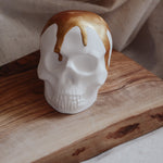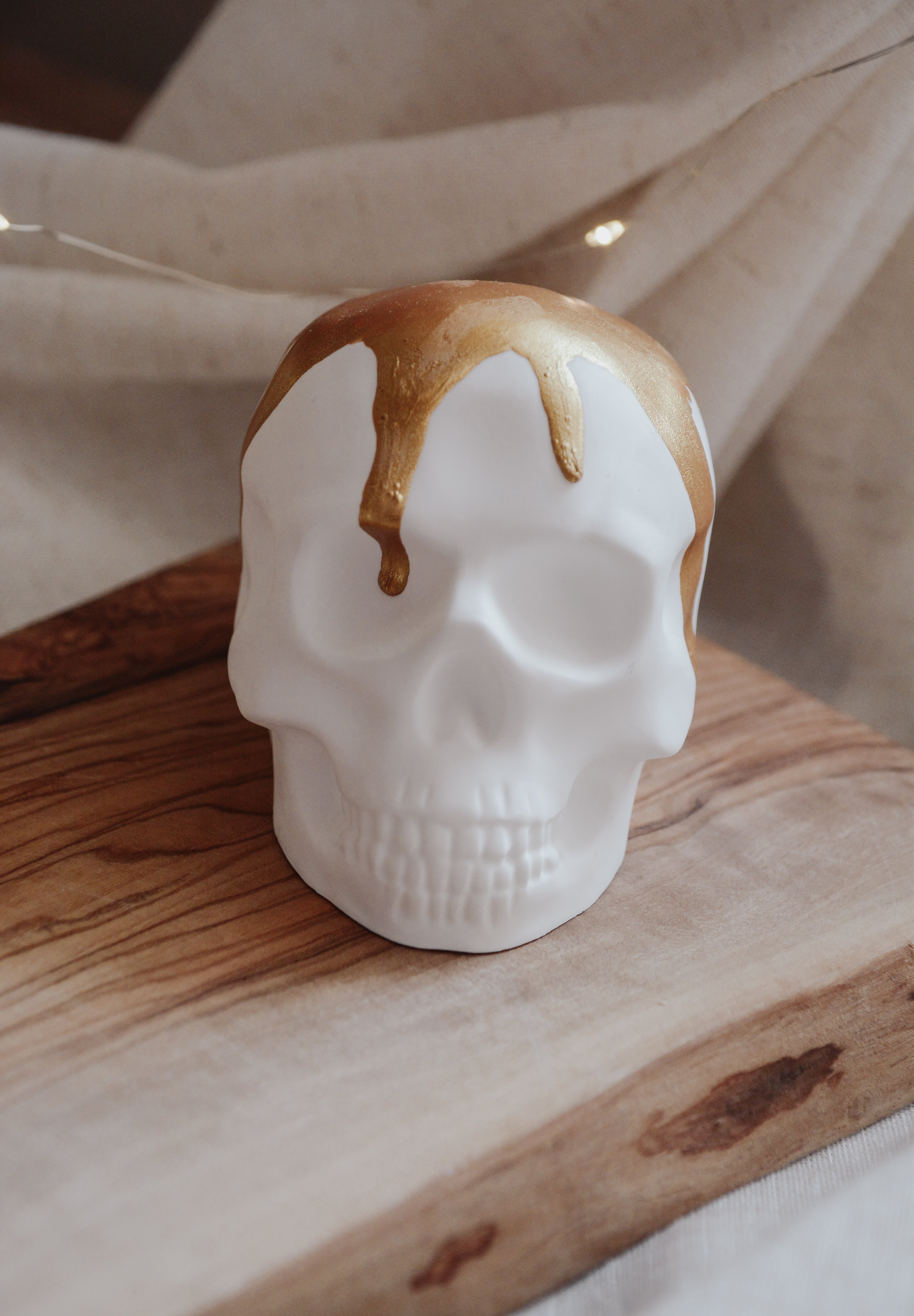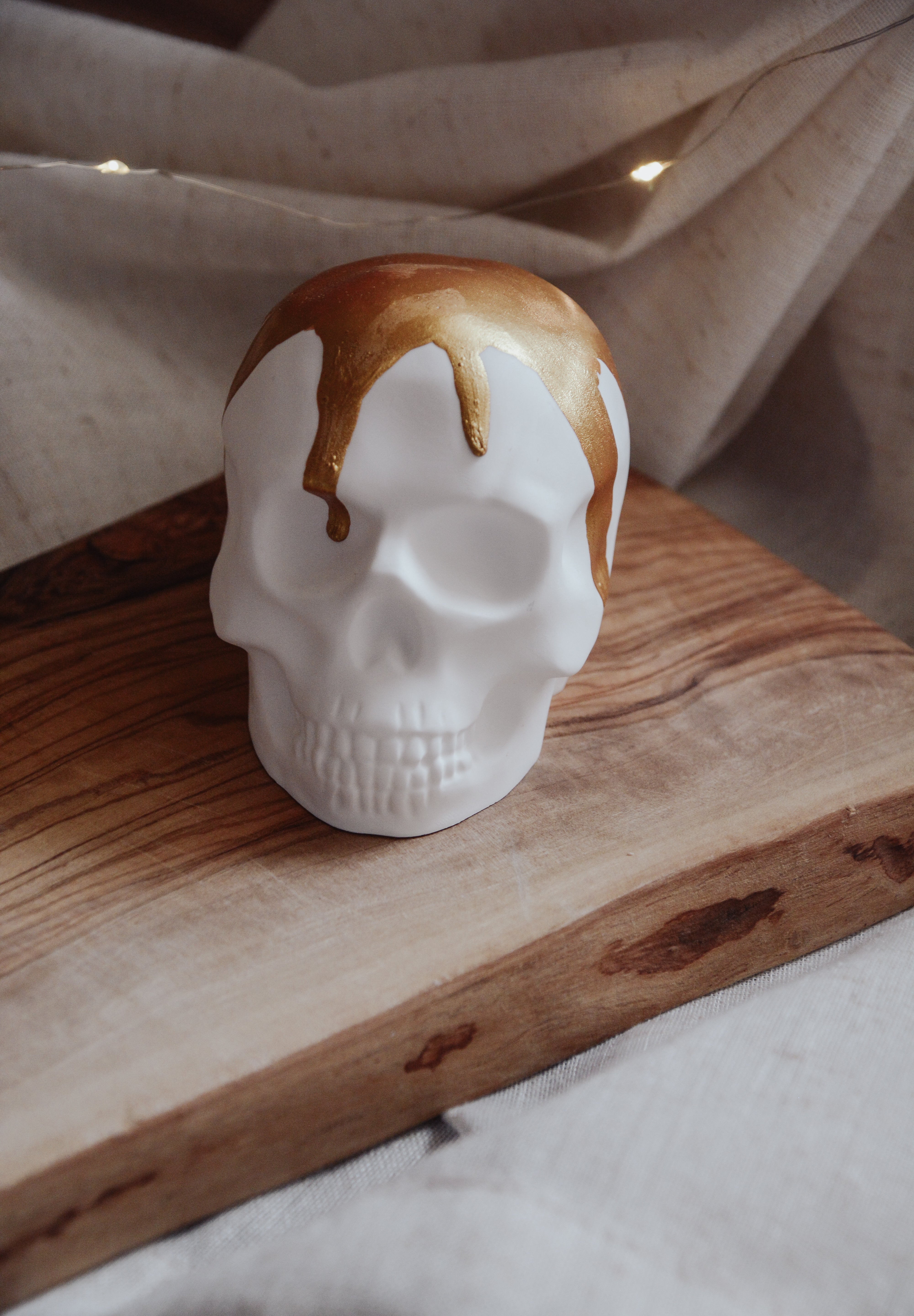 This skull sculpture features a heavy, solid form with a sophisticated design accentuated by molten gold detailing. Its striking metallic finish and substantial weight make it an impressive statement piece suited for refined, modern interiors or artistic collections. Crafted to convey strength and elegance, it adds a bold yet tasteful touch to your decor.
