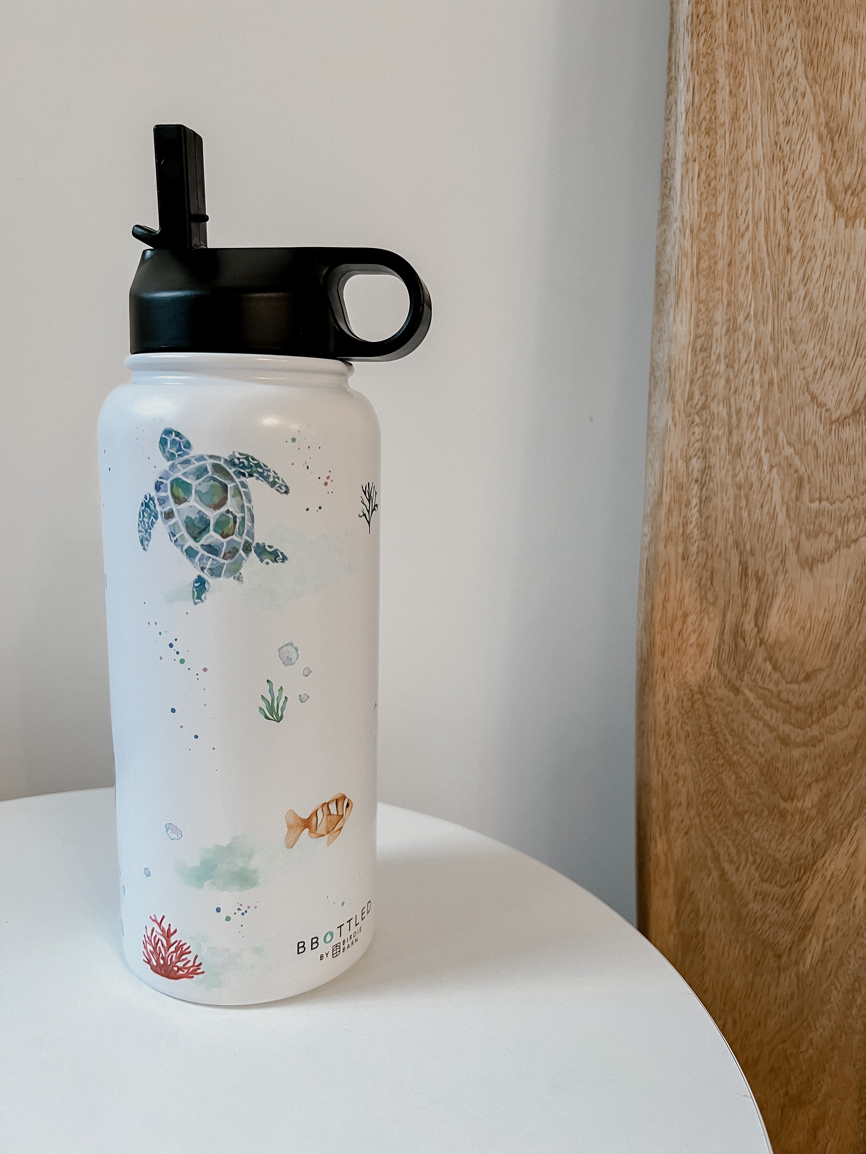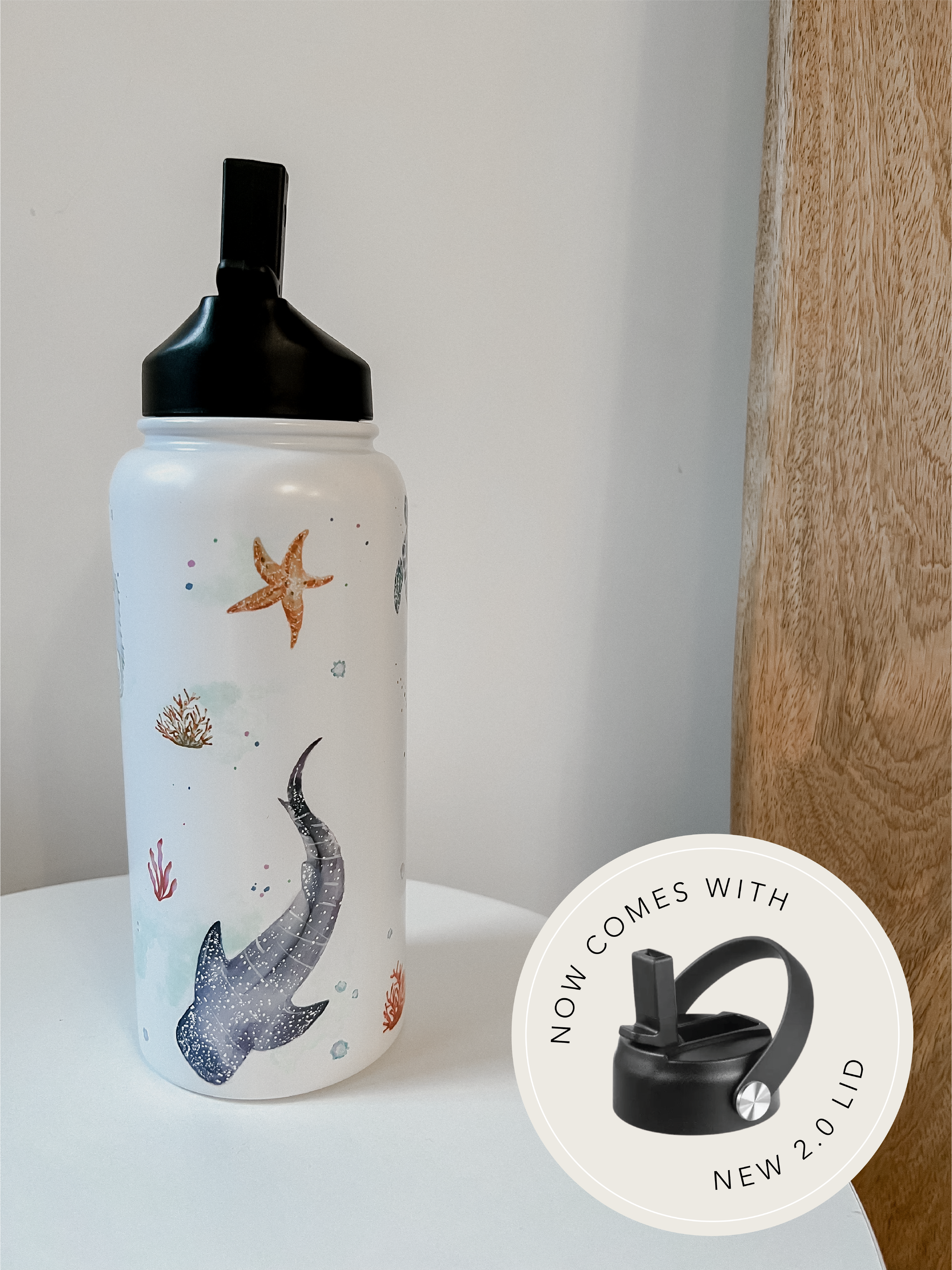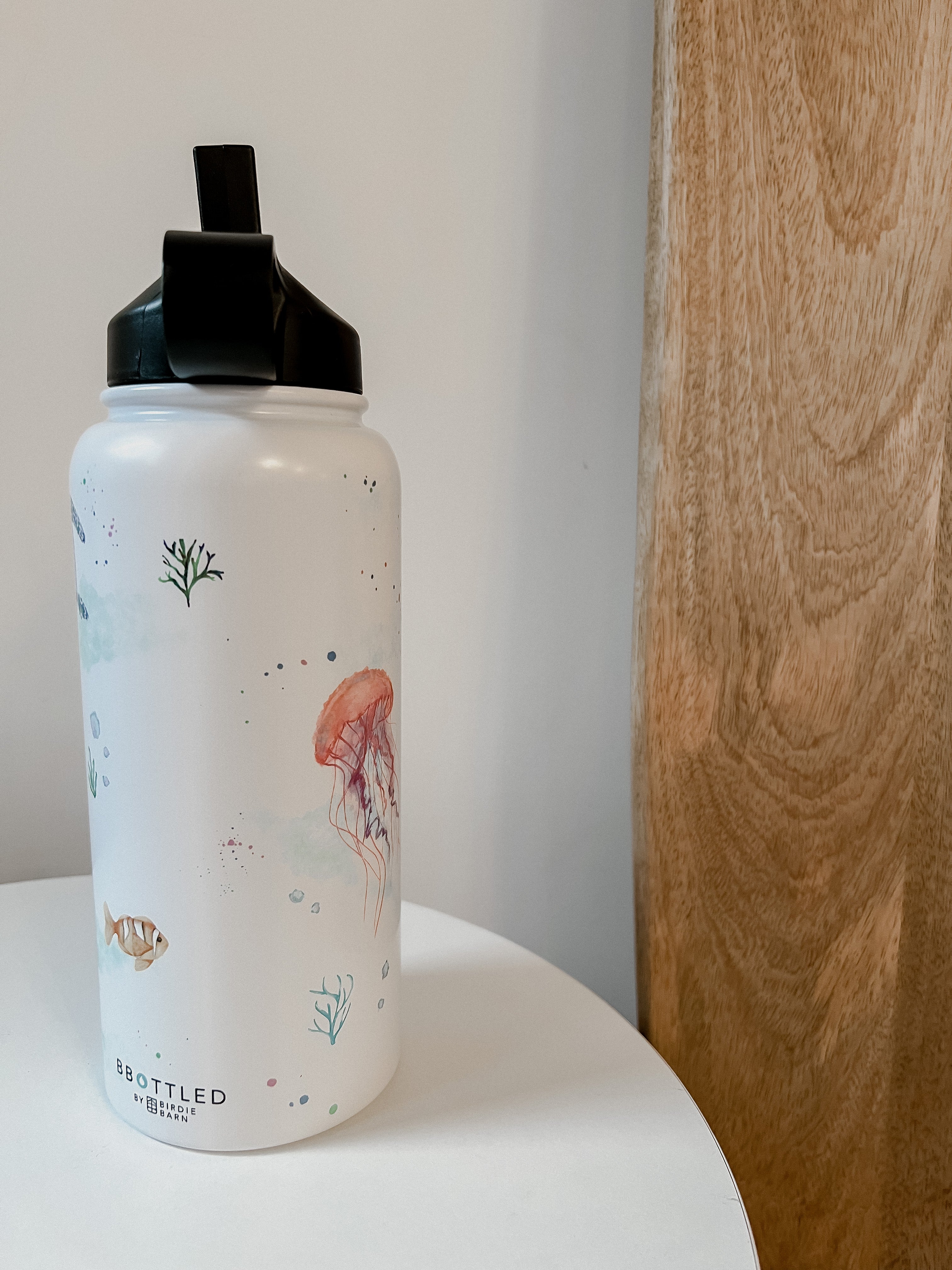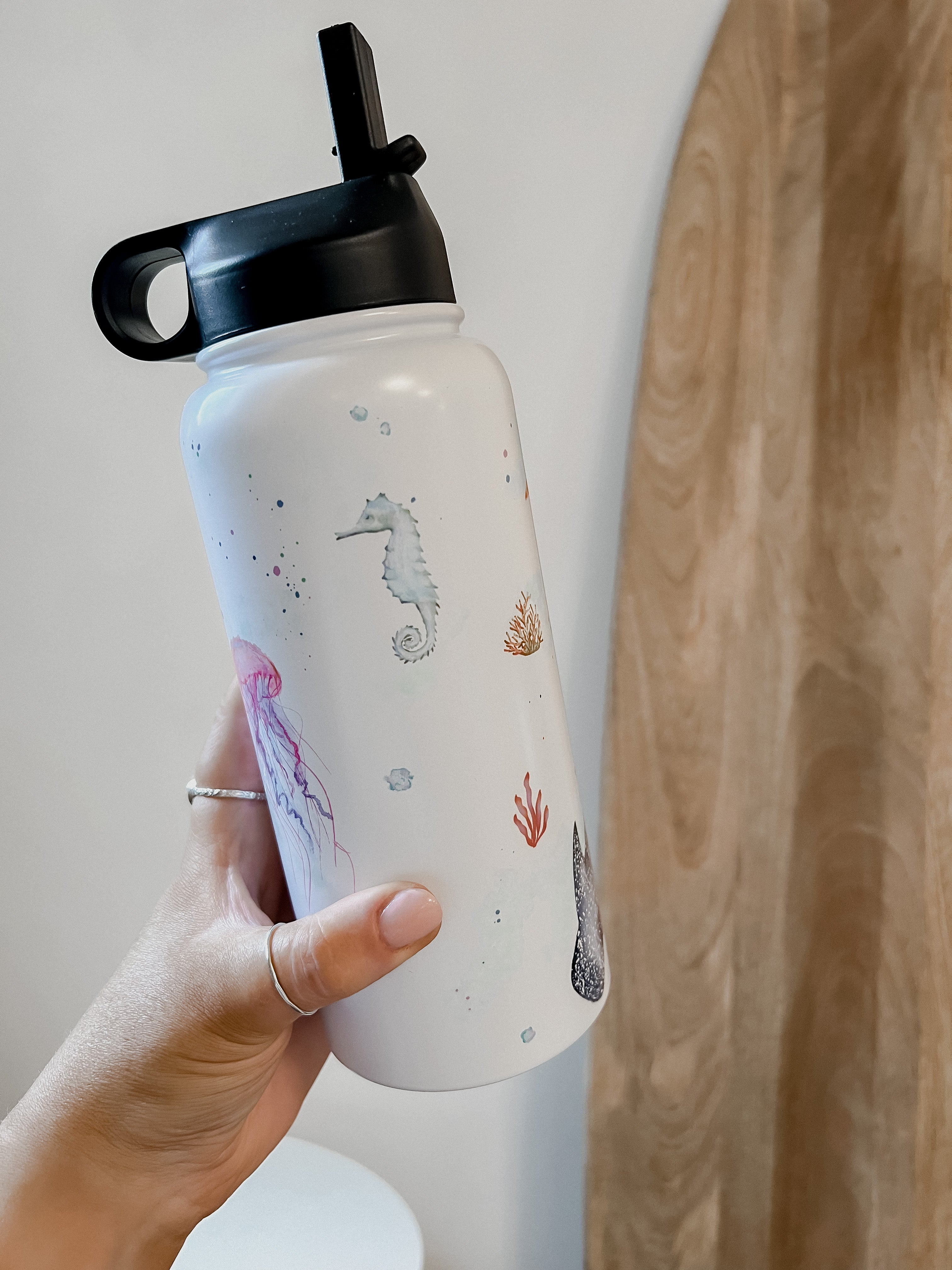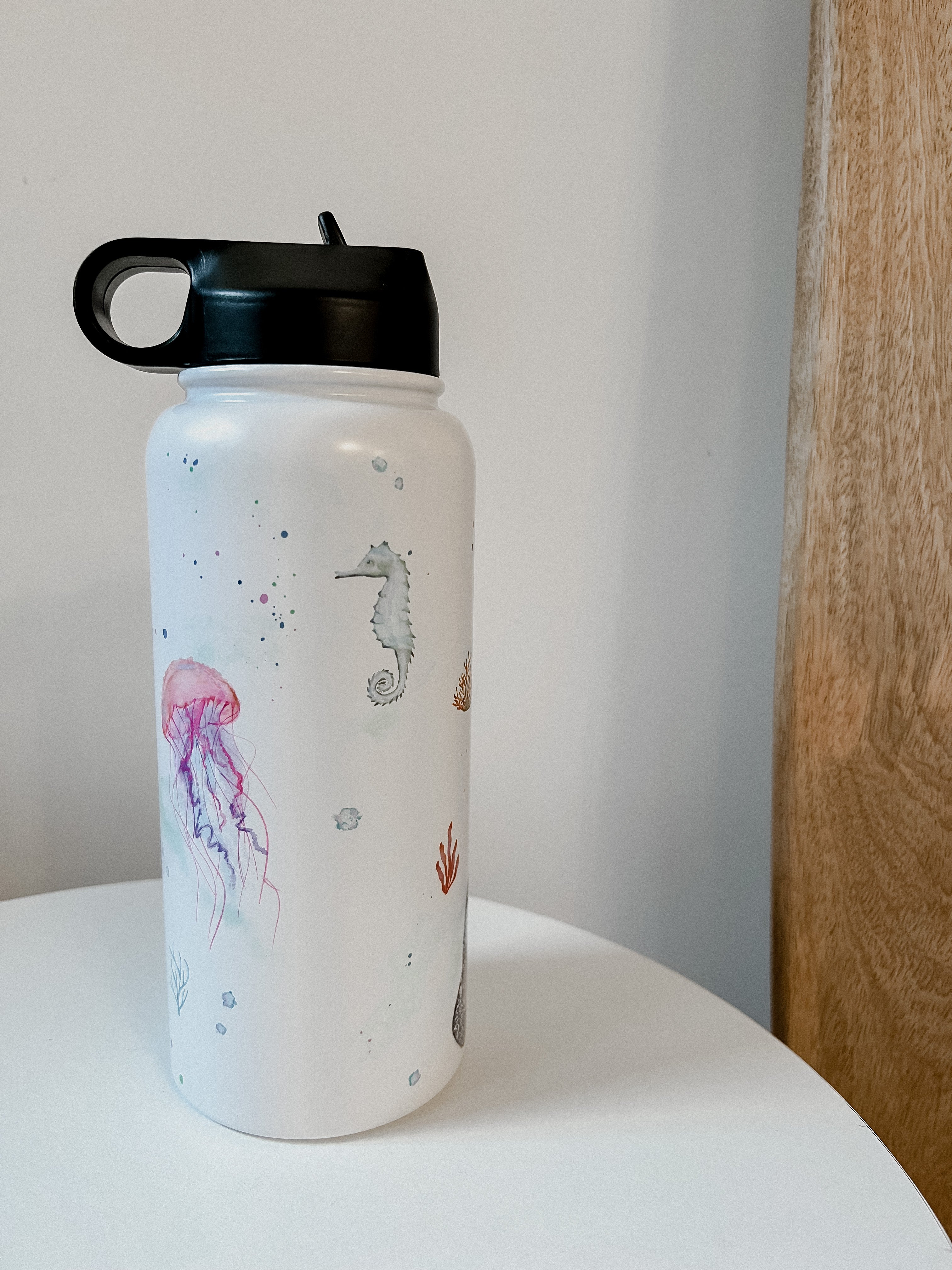 This stunning design features an array of watercolour sea creatures, such as a whale shark, jelly fish, sea horse and turtle. The design is complete with bubbles and corals around the entirety of the tumbler.