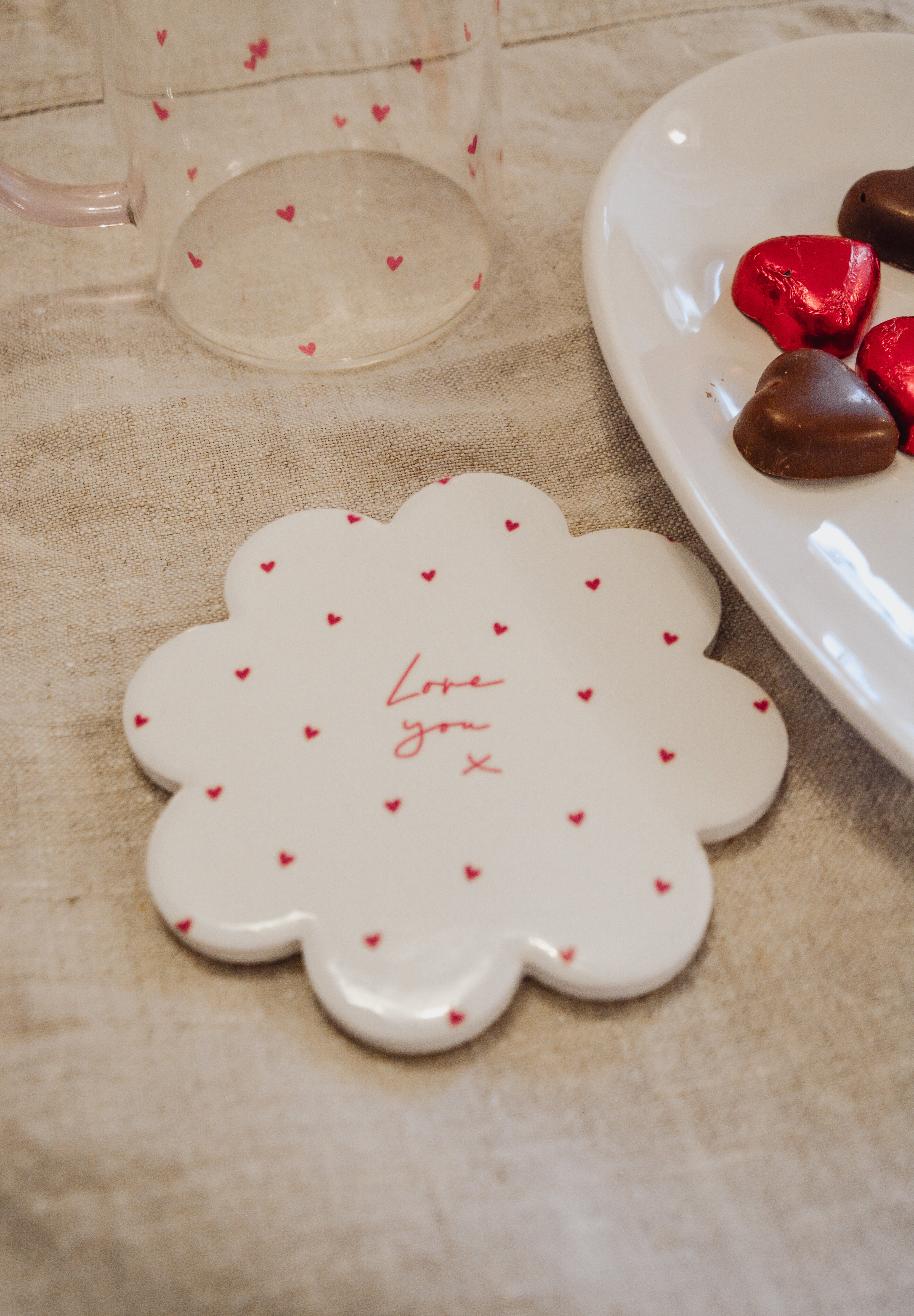 Celebrate love every day with our Love Hearts Ceramic Flower Shape Coaster. Perfect for Valentine's Day or any day, these coasters can feature your own personalised message and add a cute touch to your home decor.