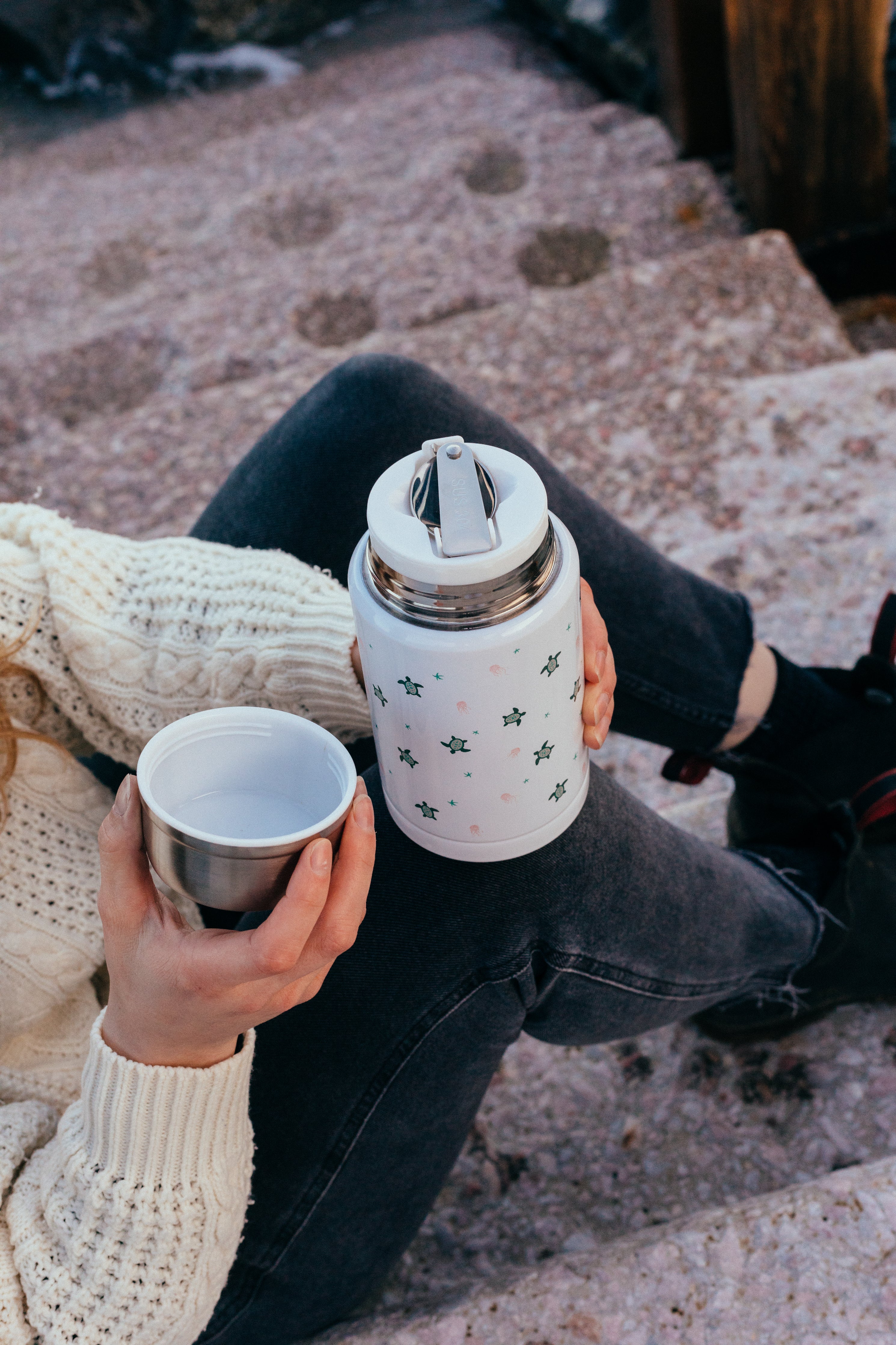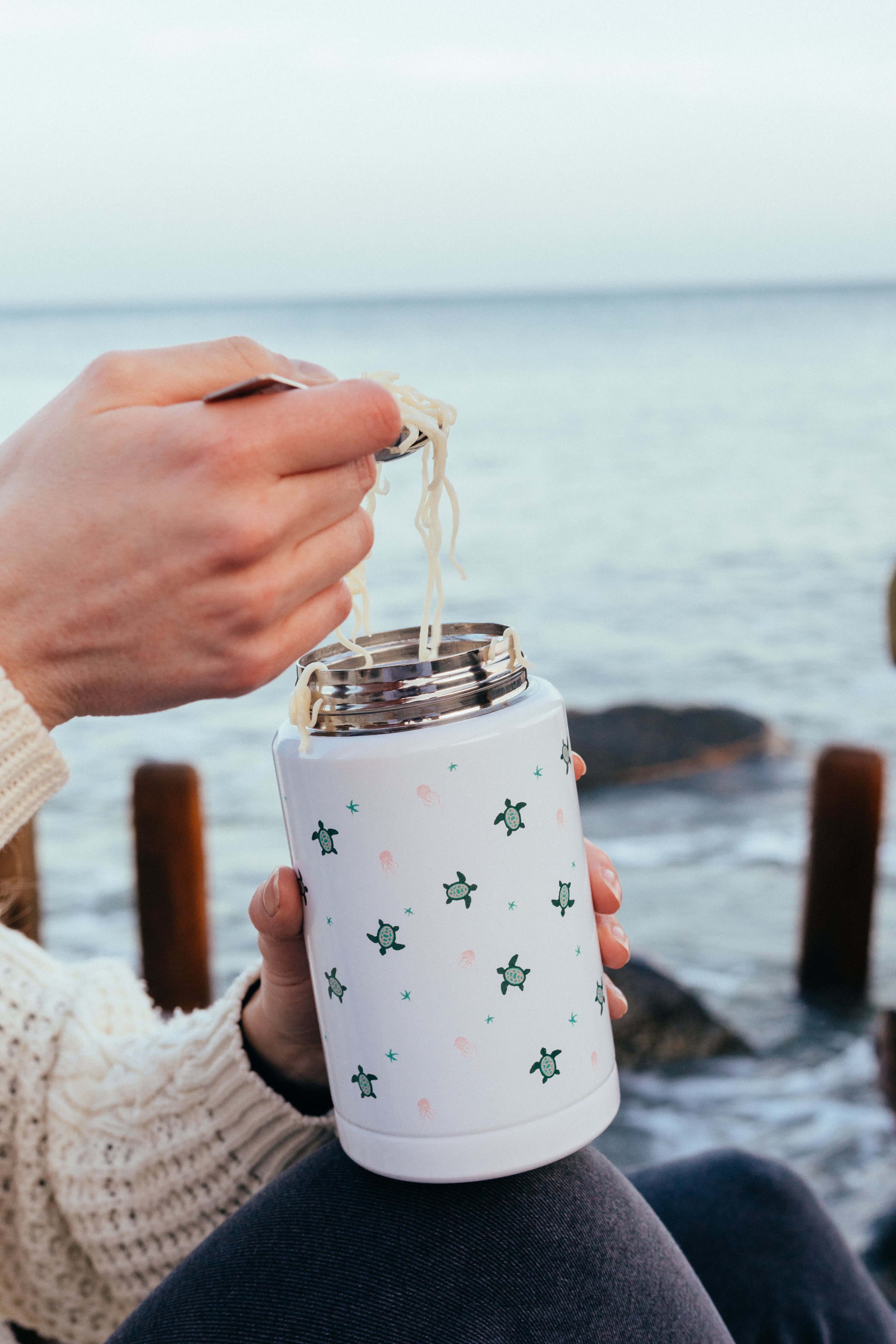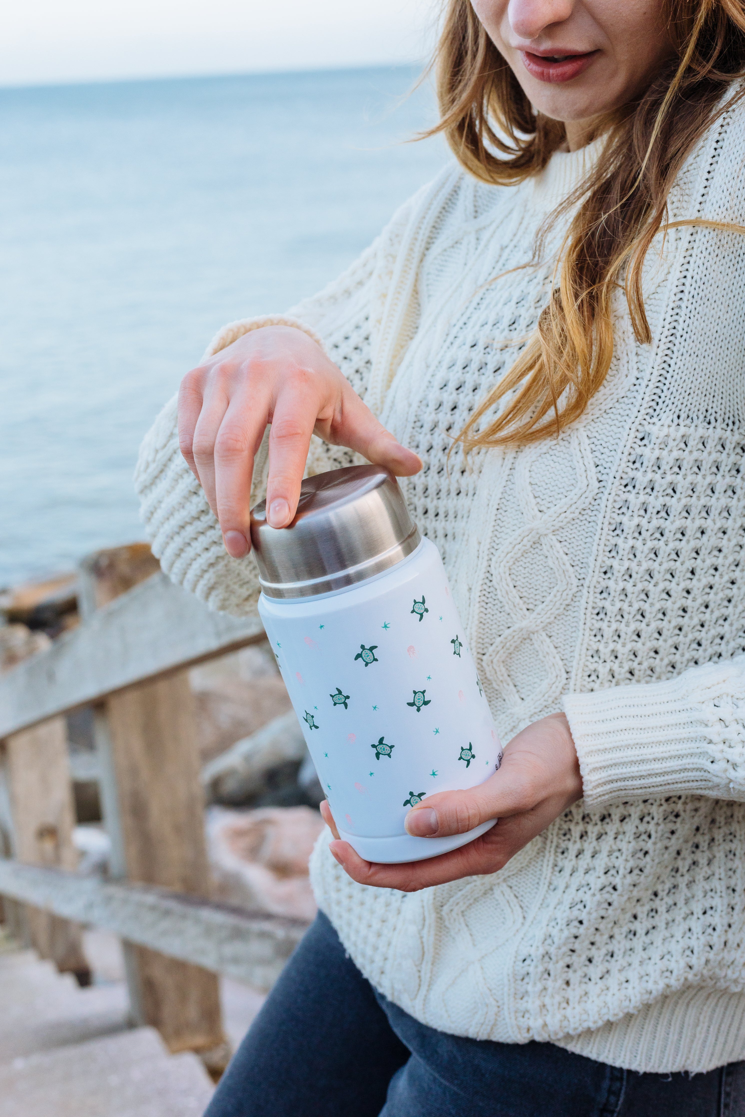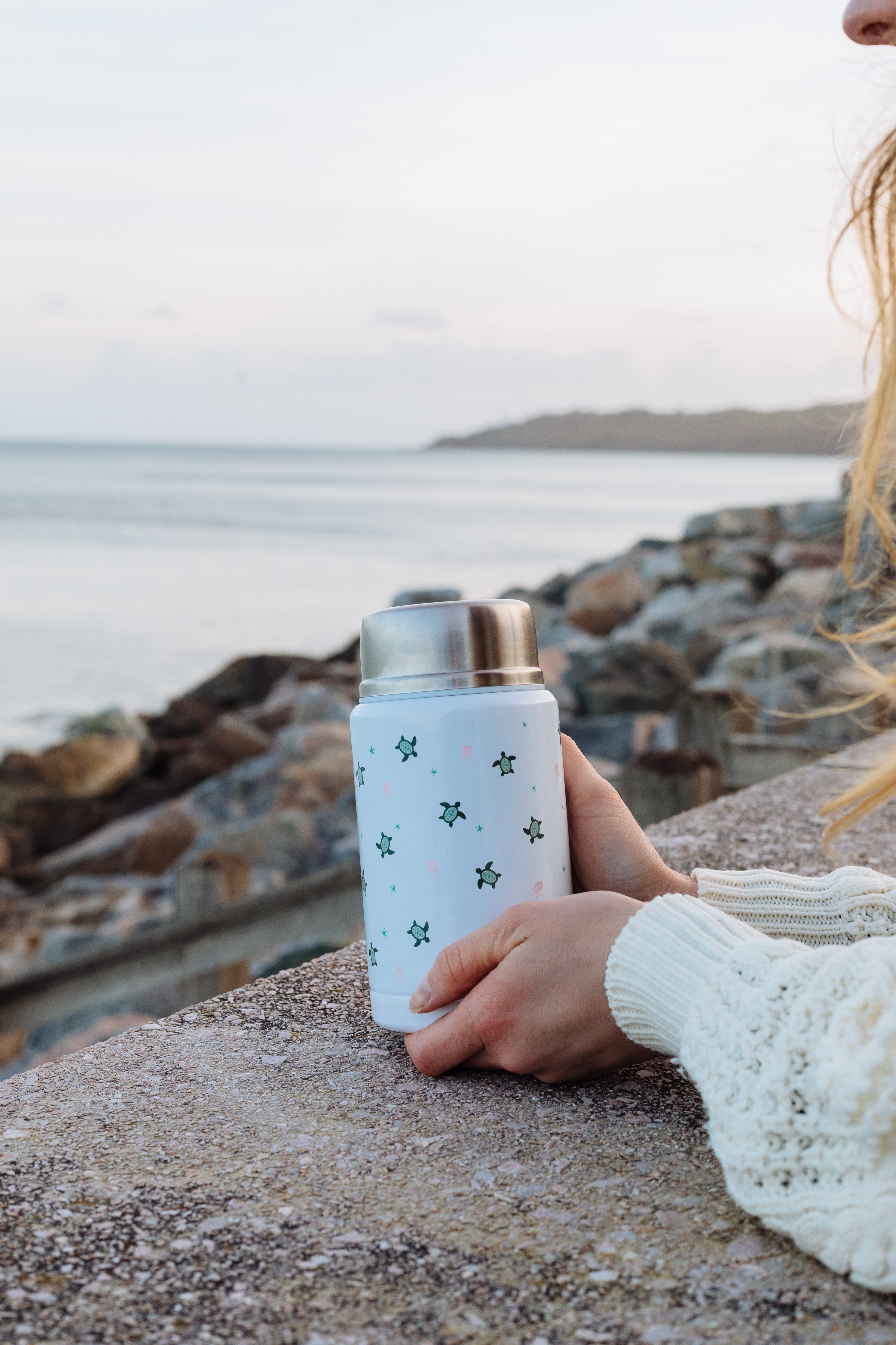 Enjoy your yummy food with this super cute design turtles flask, featuring turtles, jelly fish and star fish on a stunning sage green and muted pink colour palette.