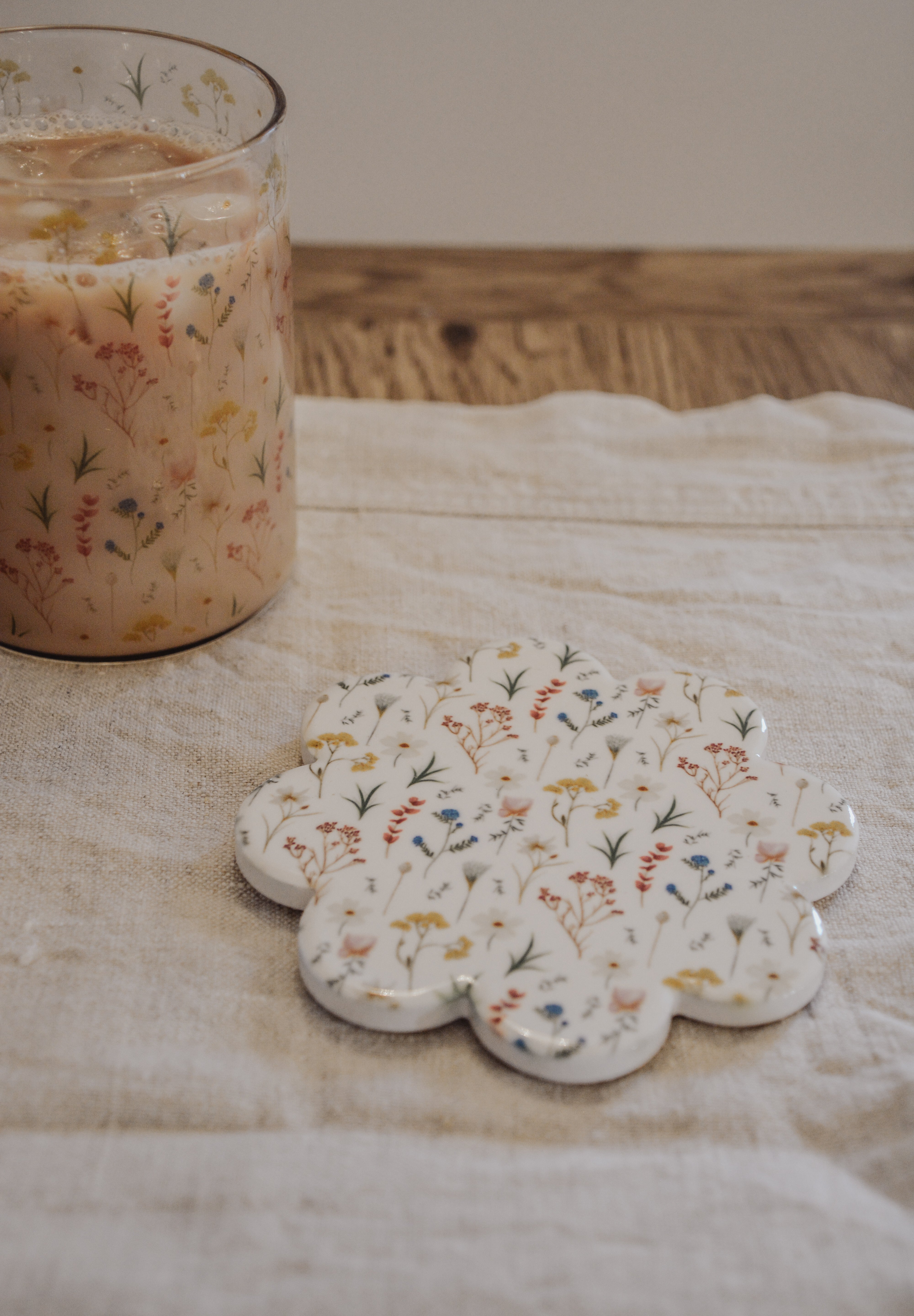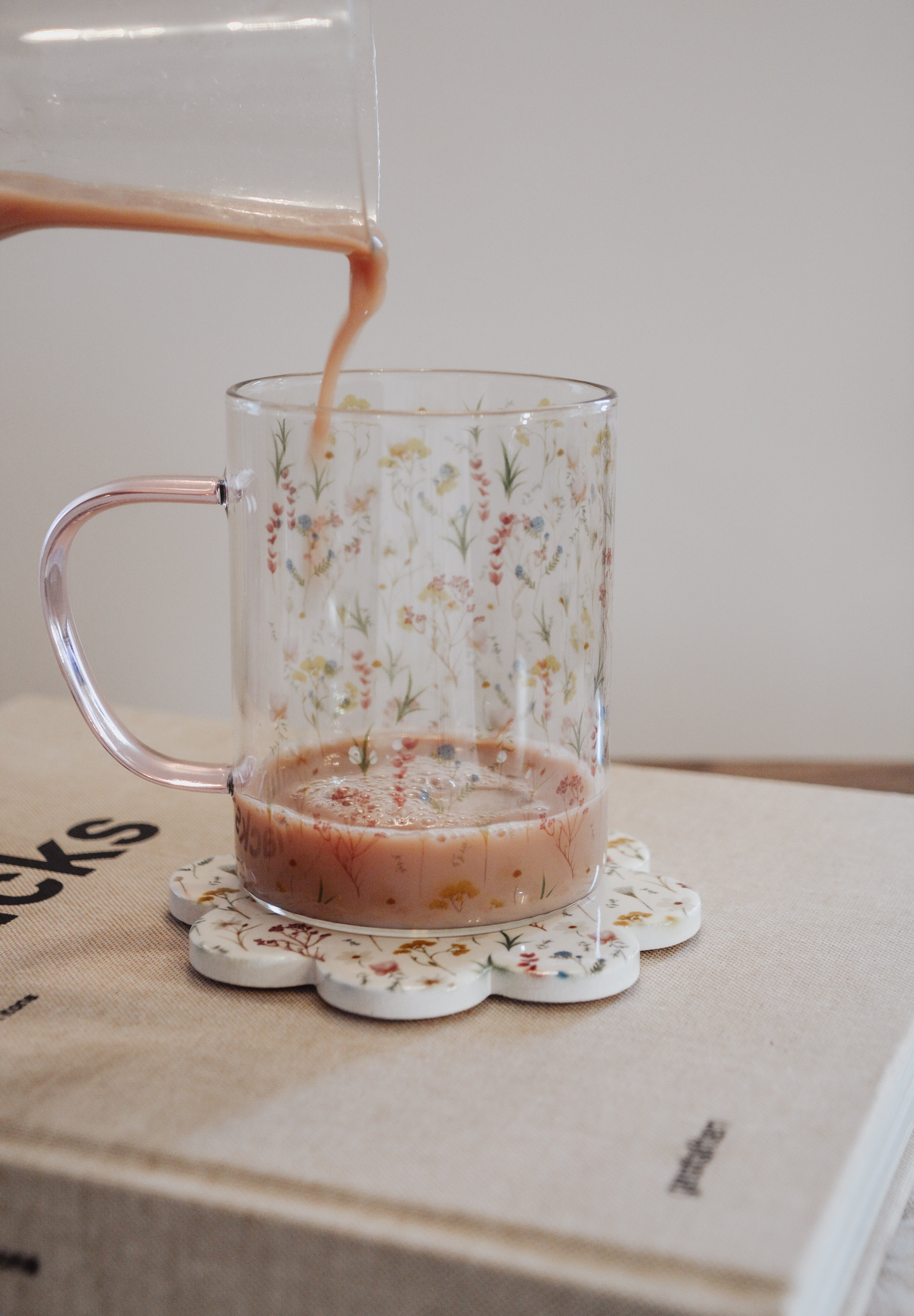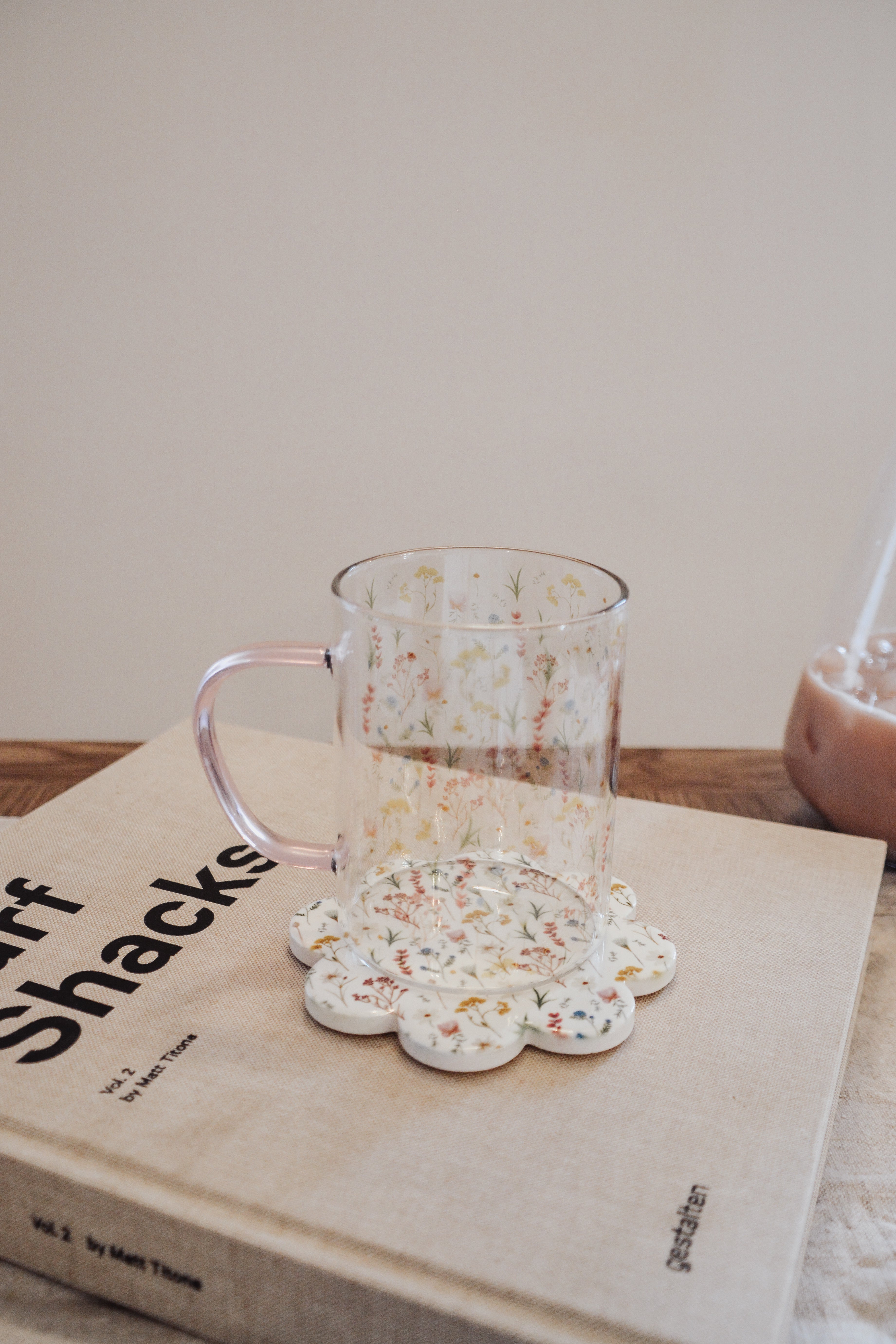 These chic glass mugs are the perfect accompaniment to your desk or dinner table. The subtle floral print and straight profile of the mug adds a delicate touch to your slow morning.