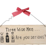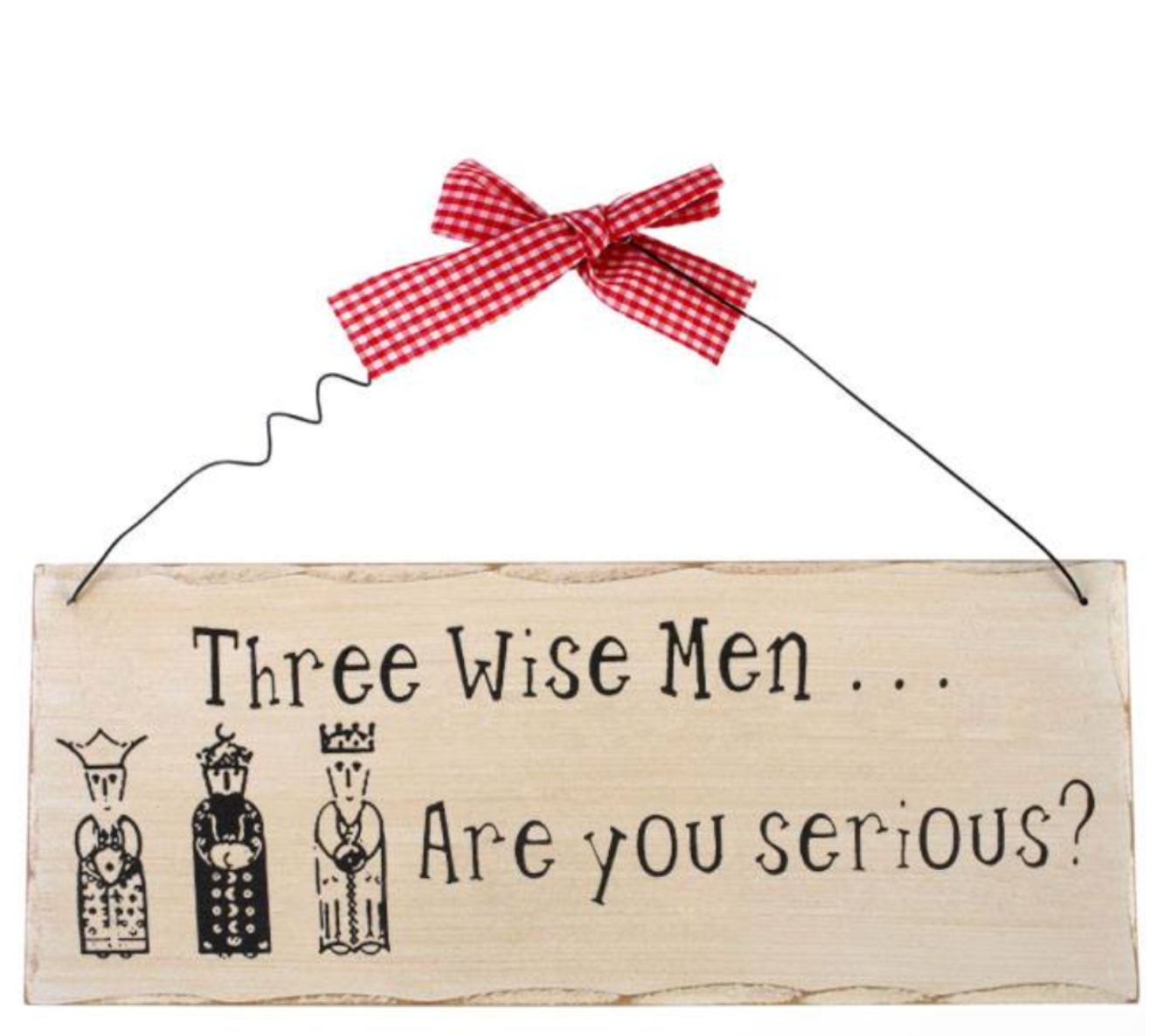A shabby chic style Three Wise Men design wooden wall plaque with a gingham patterned bow.