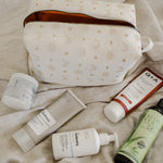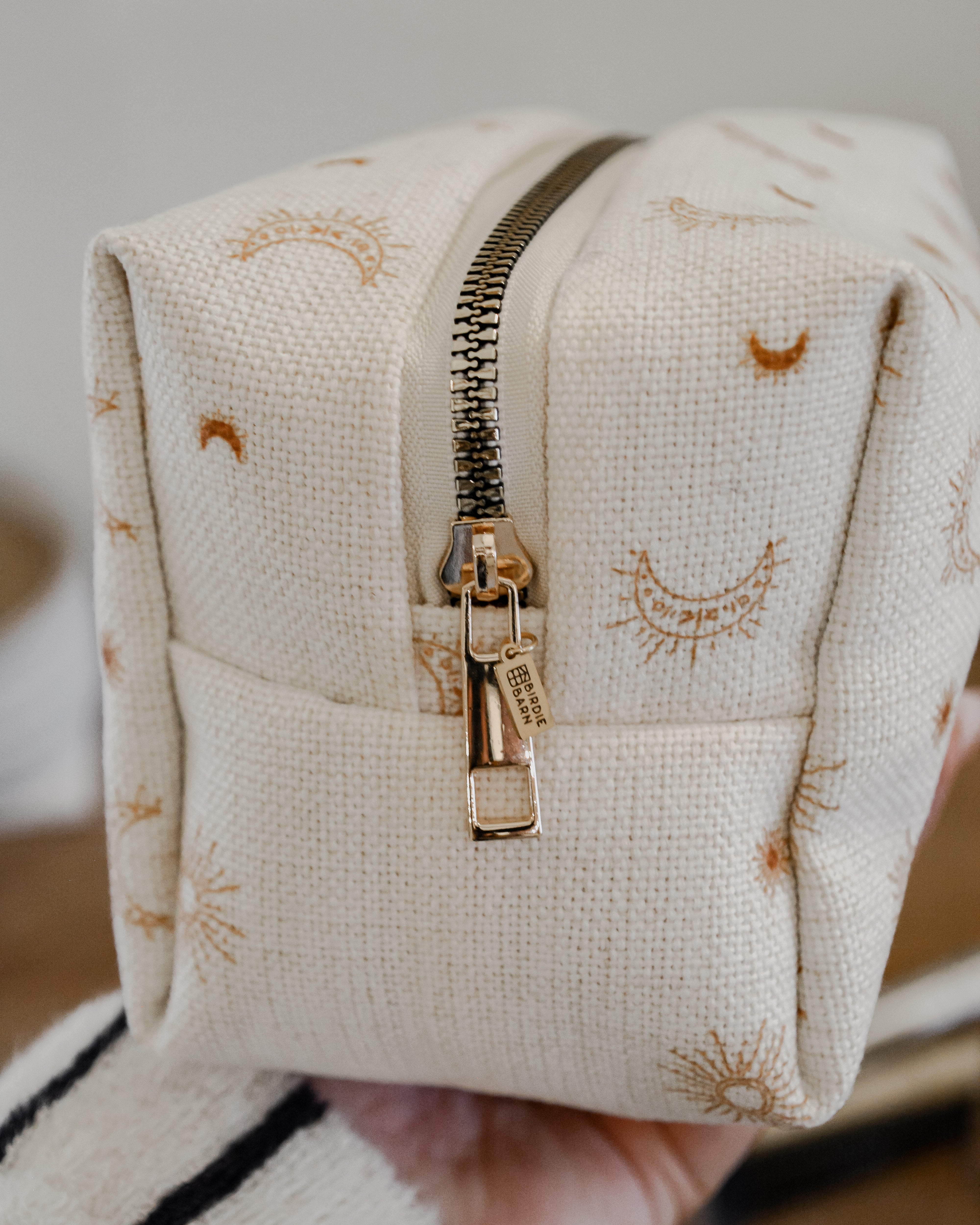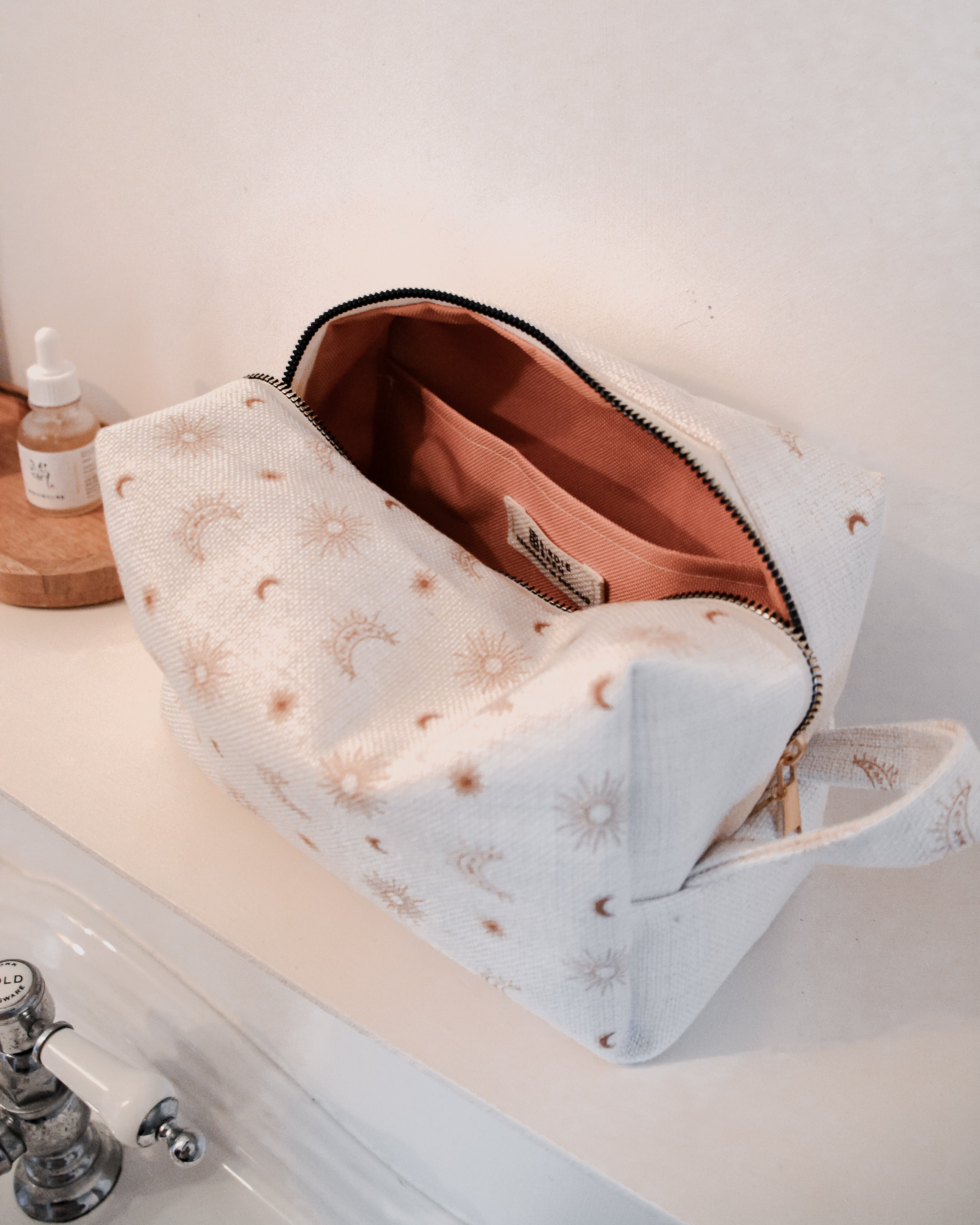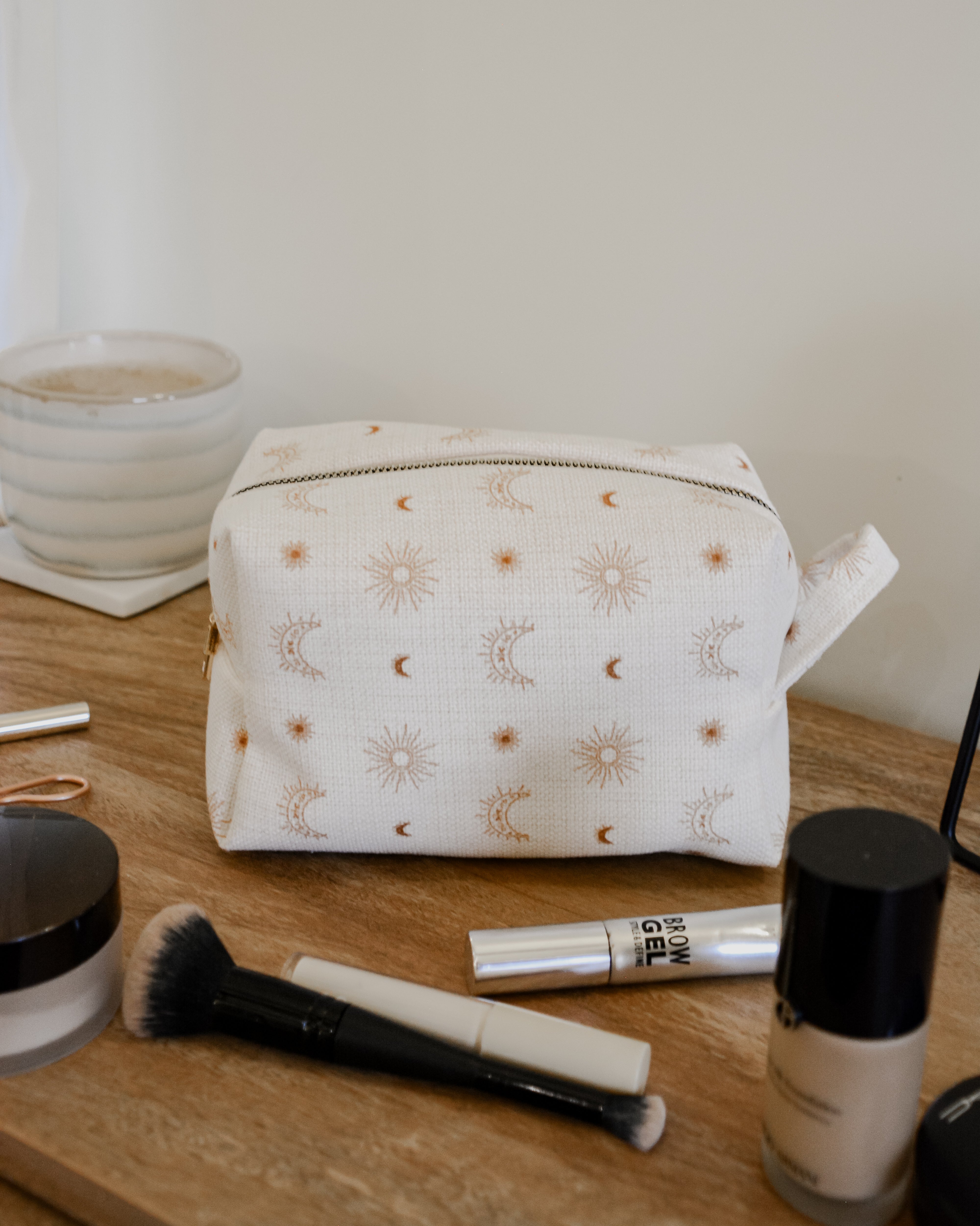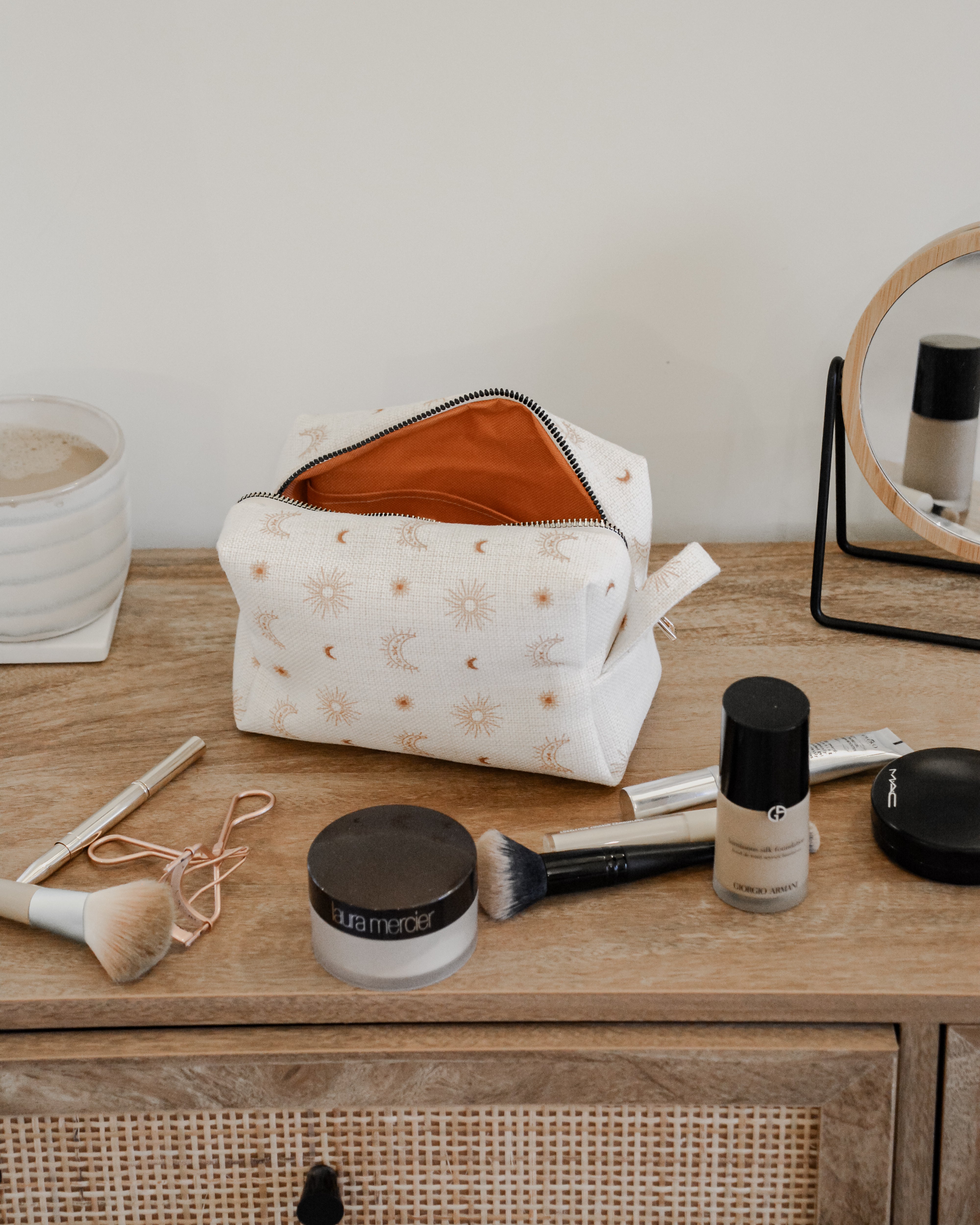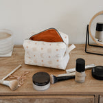 Each bag is handcrafted in our signature material and hand printed in our ever so popular warm and earthy Burnt Boho design. Each size is meticulously made to withstand daily touch-ups or routing through your entire skincare arsenal. Featuring thick internal waterproof canvas lining with a pocket that keeps your essentials safe from spills and splashes. The rich, earthy burnt tones with additional gold metal hardware add a touch of luxury to your vanity or travel kit.