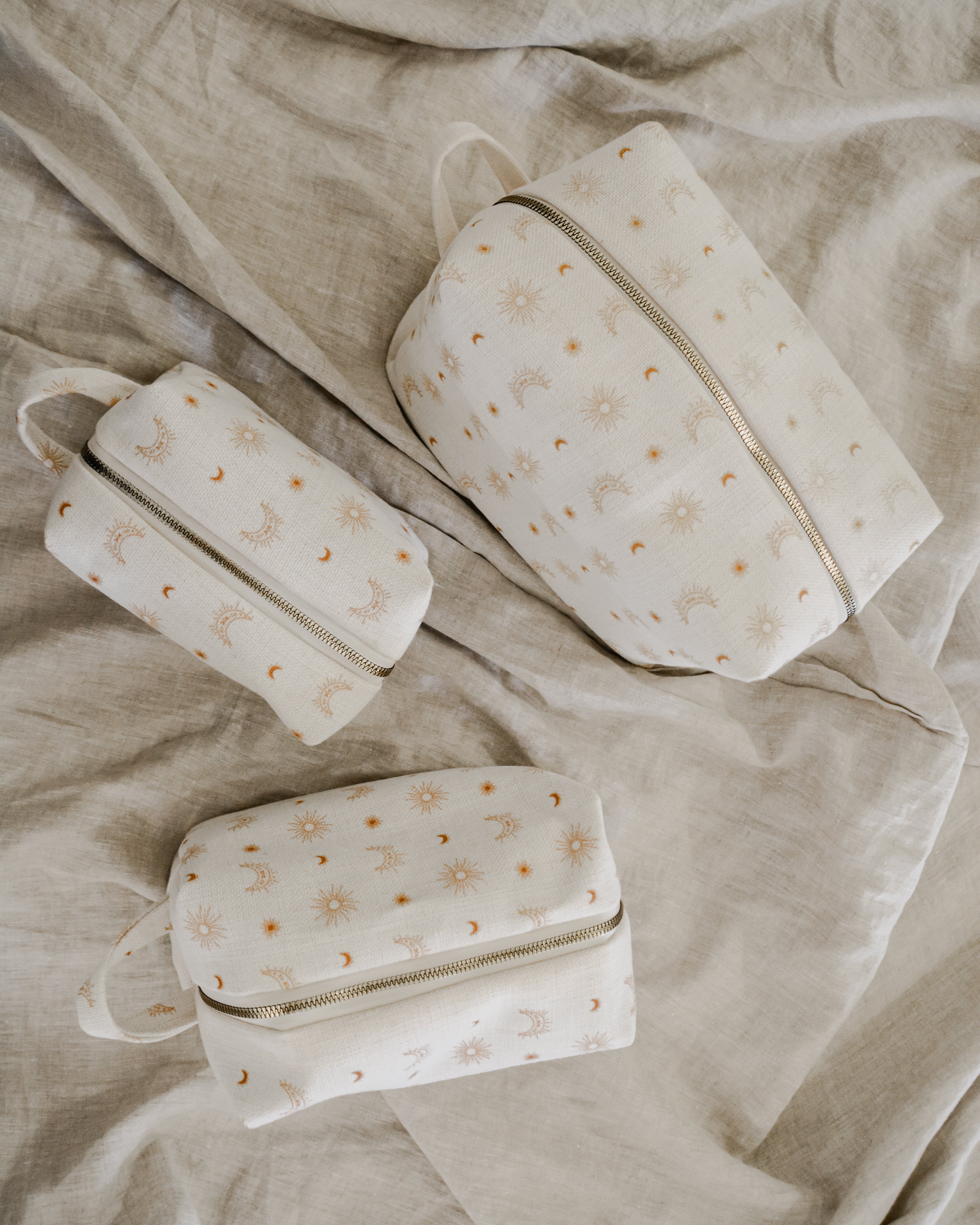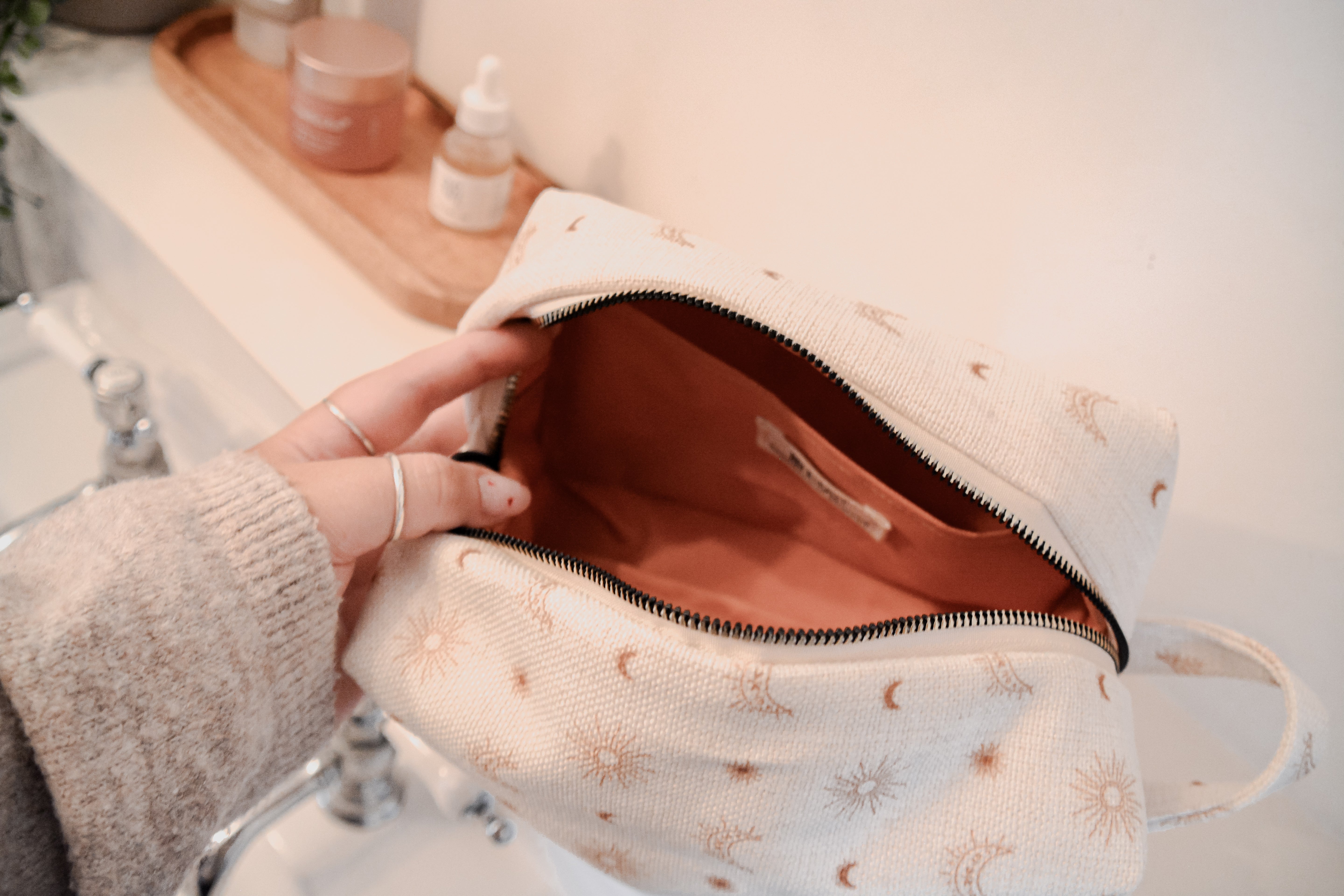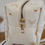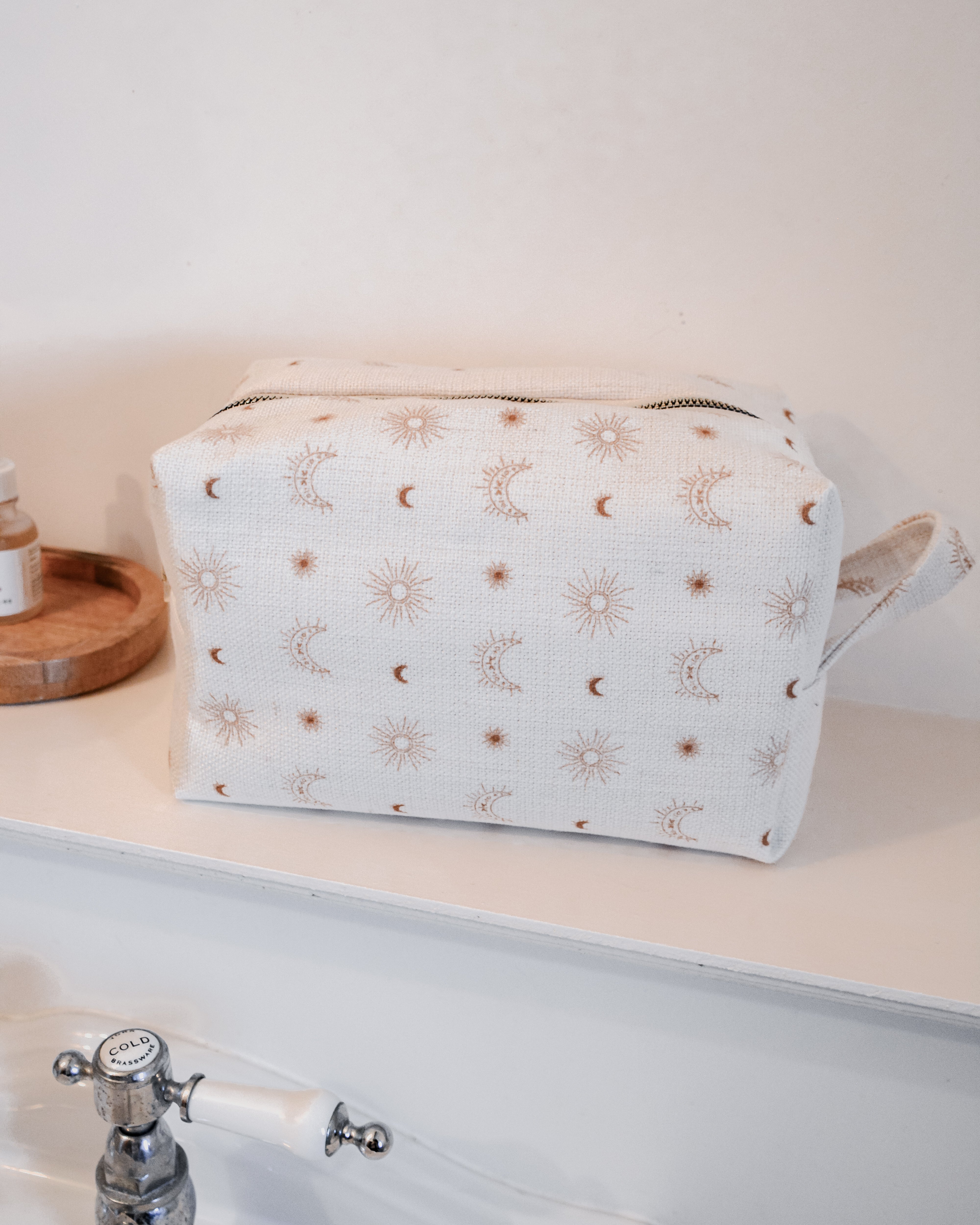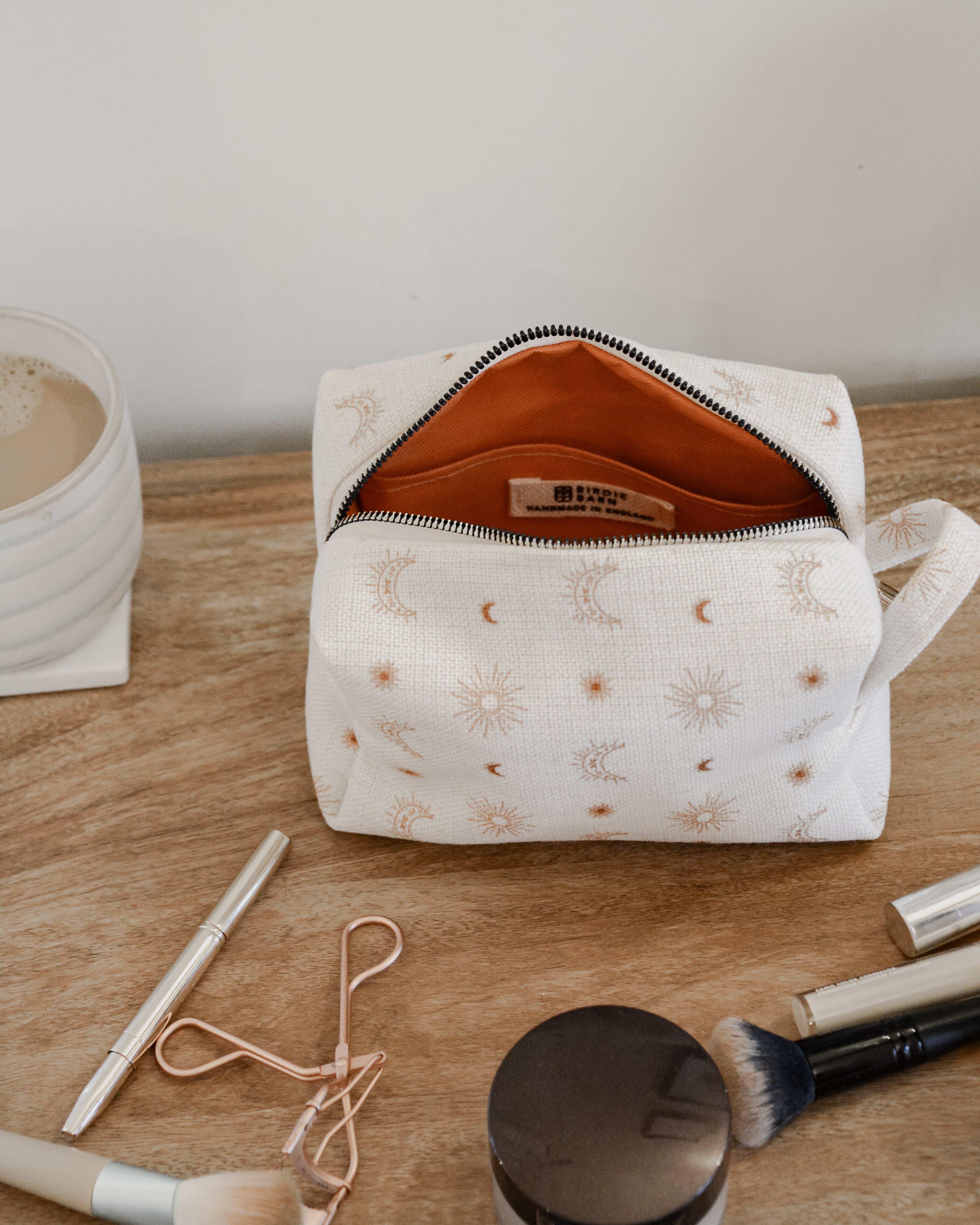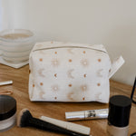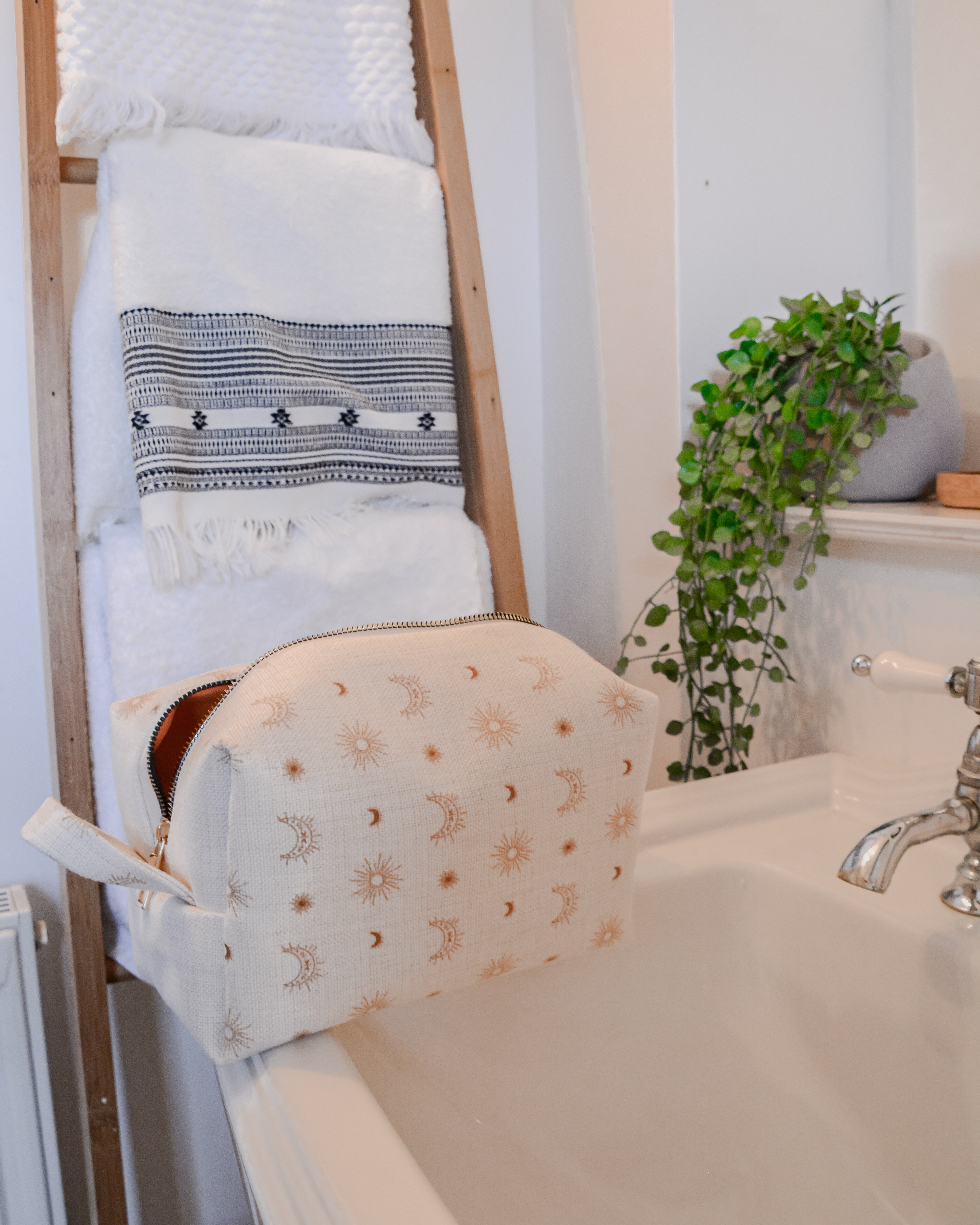 Each bag is handcrafted in our signature material and hand printed in our ever so popular warm and earthy Burnt Boho design. Each size is meticulously made to withstand daily touch-ups or routing through your entire skincare arsenal. Featuring thick internal waterproof canvas lining with a pocket that keeps your essentials safe from spills and splashes. The rich, earthy burnt tones with additional gold metal hardware add a touch of luxury to your vanity or travel kit.