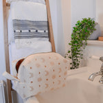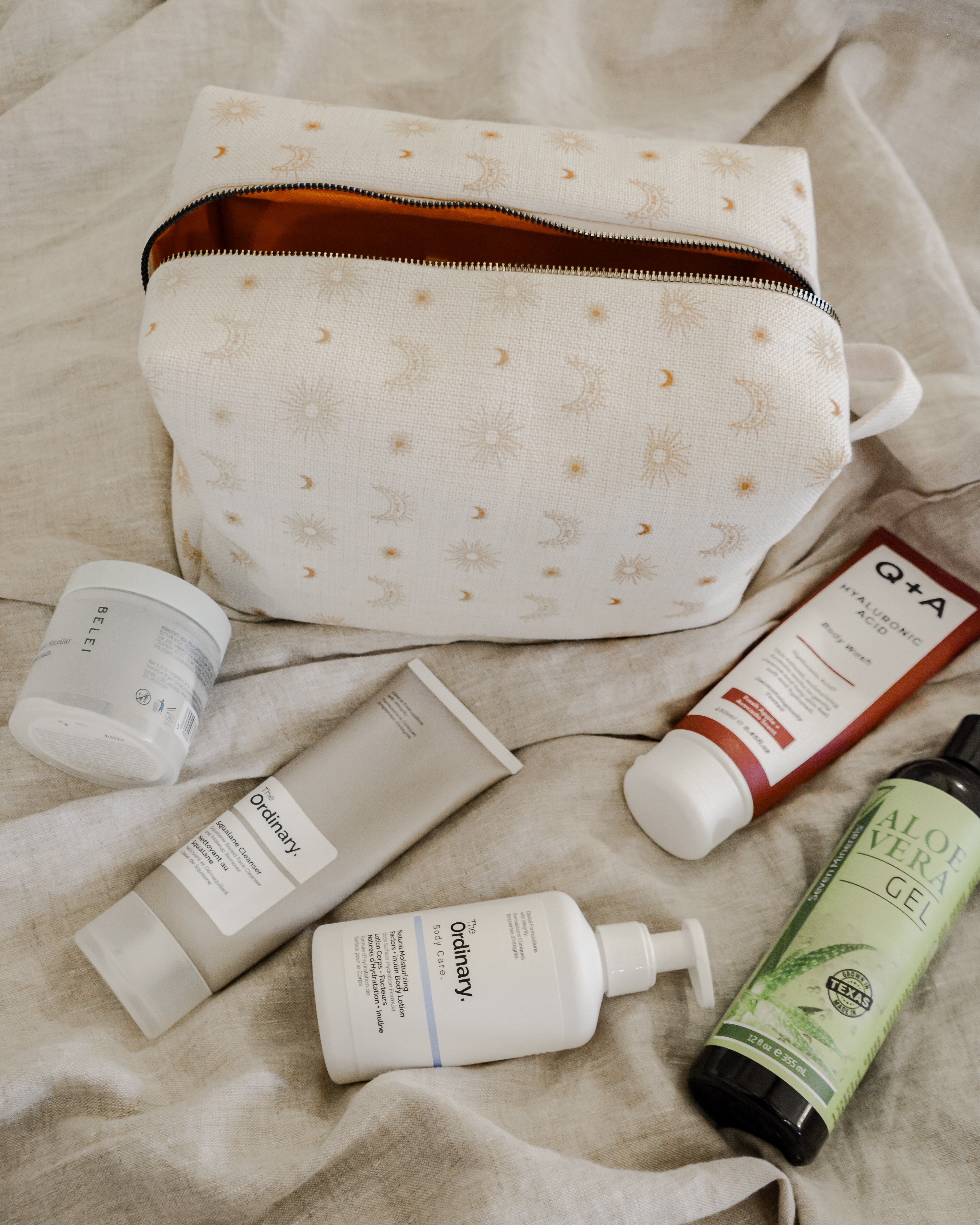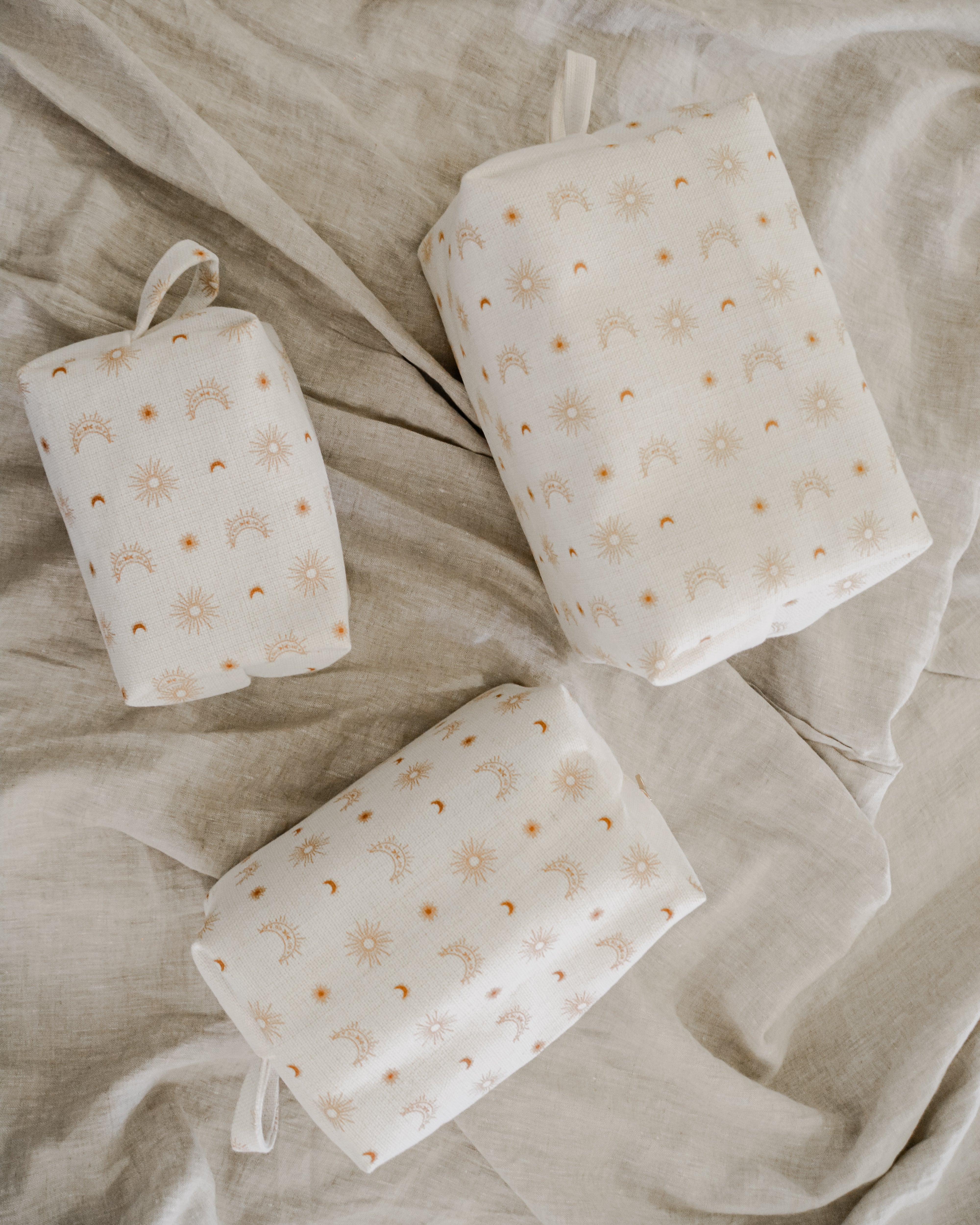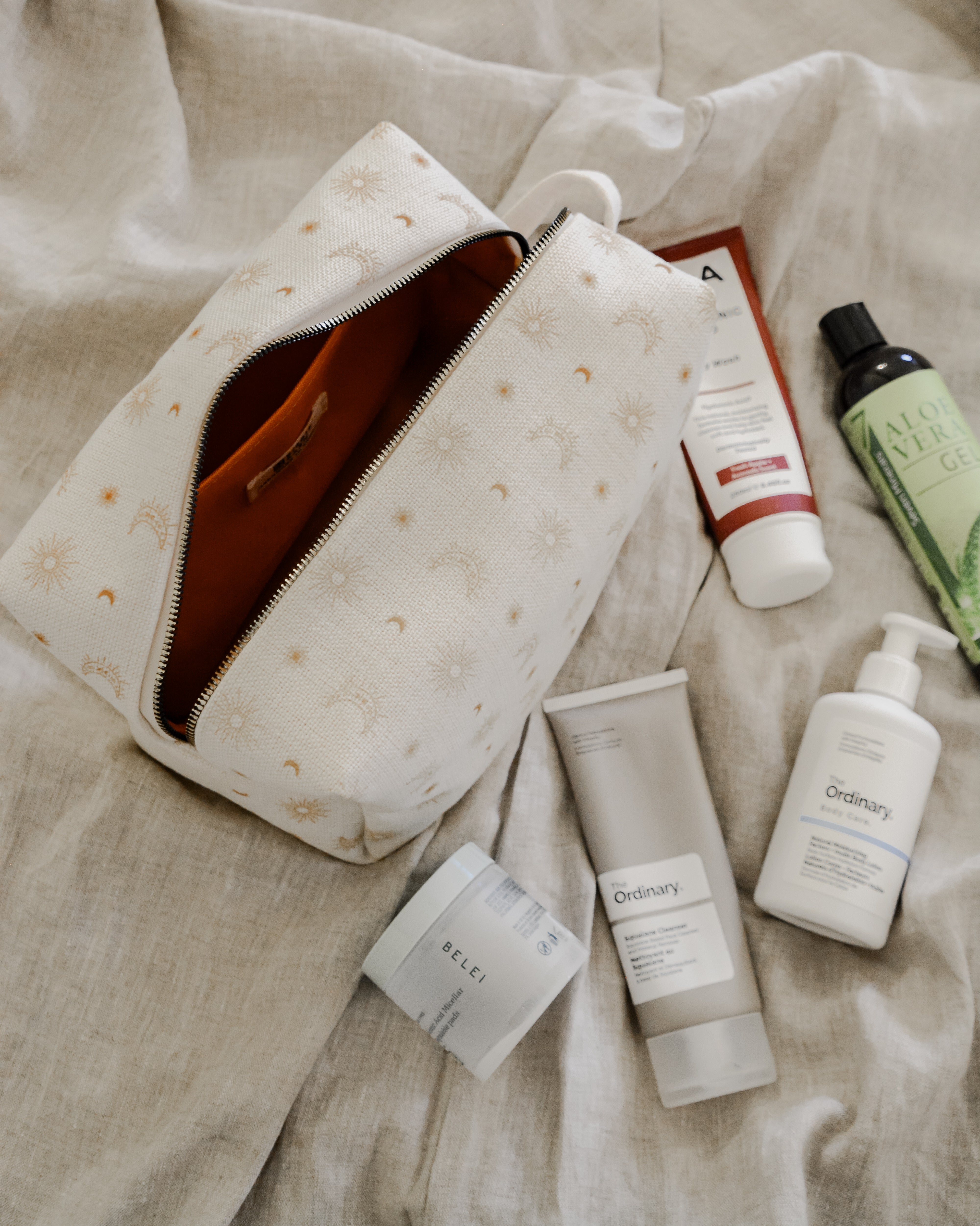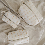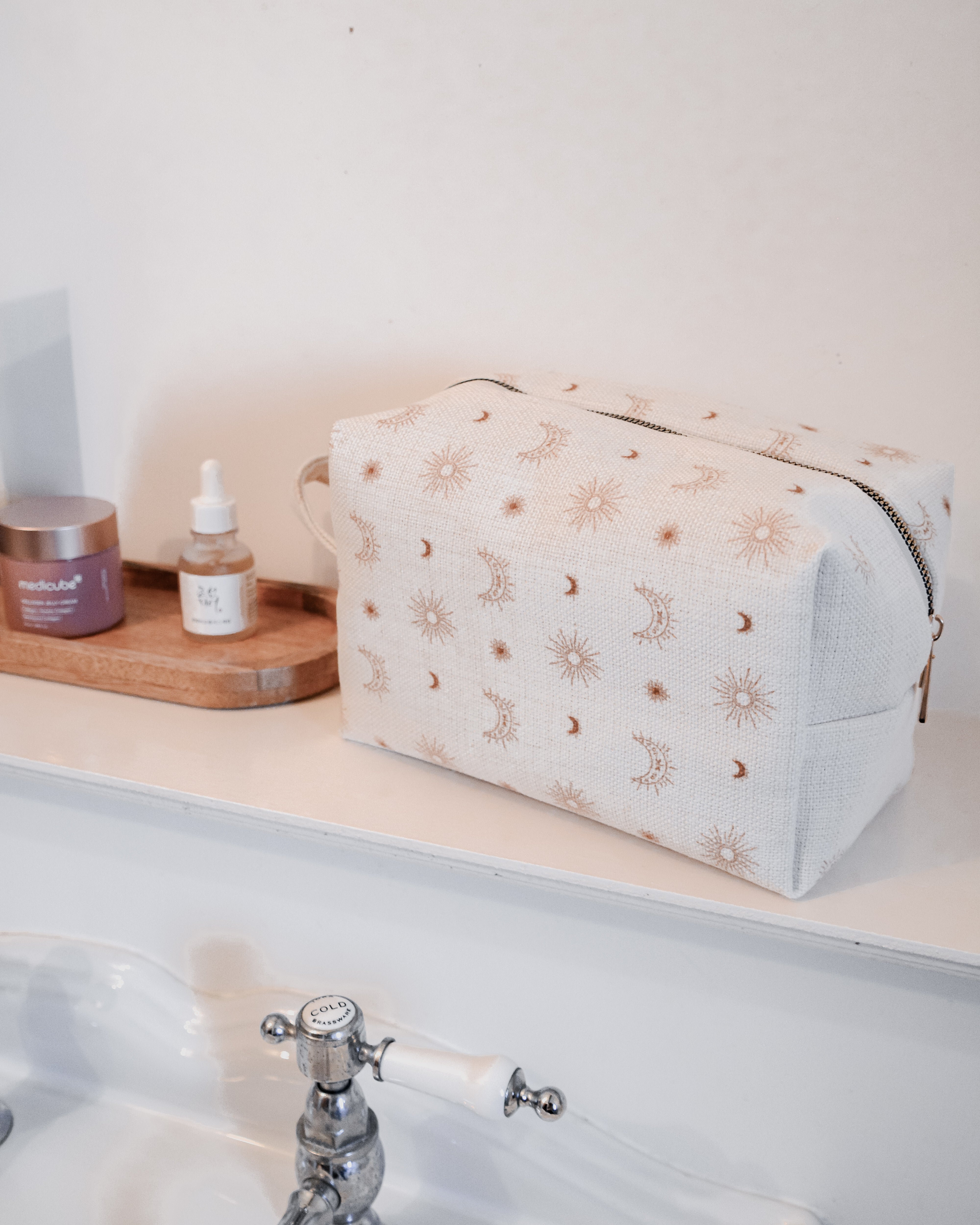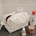 Each bag is handcrafted in our signature material and hand printed in our ever so popular warm and earthy Burnt Boho design. Each size is meticulously made to withstand daily touch-ups or routing through your entire skincare arsenal. Featuring thick internal waterproof canvas lining with a pocket that keeps your essentials safe from spills and splashes. The rich, earthy burnt tones with additional gold metal hardware add a touch of luxury to your vanity or travel kit.