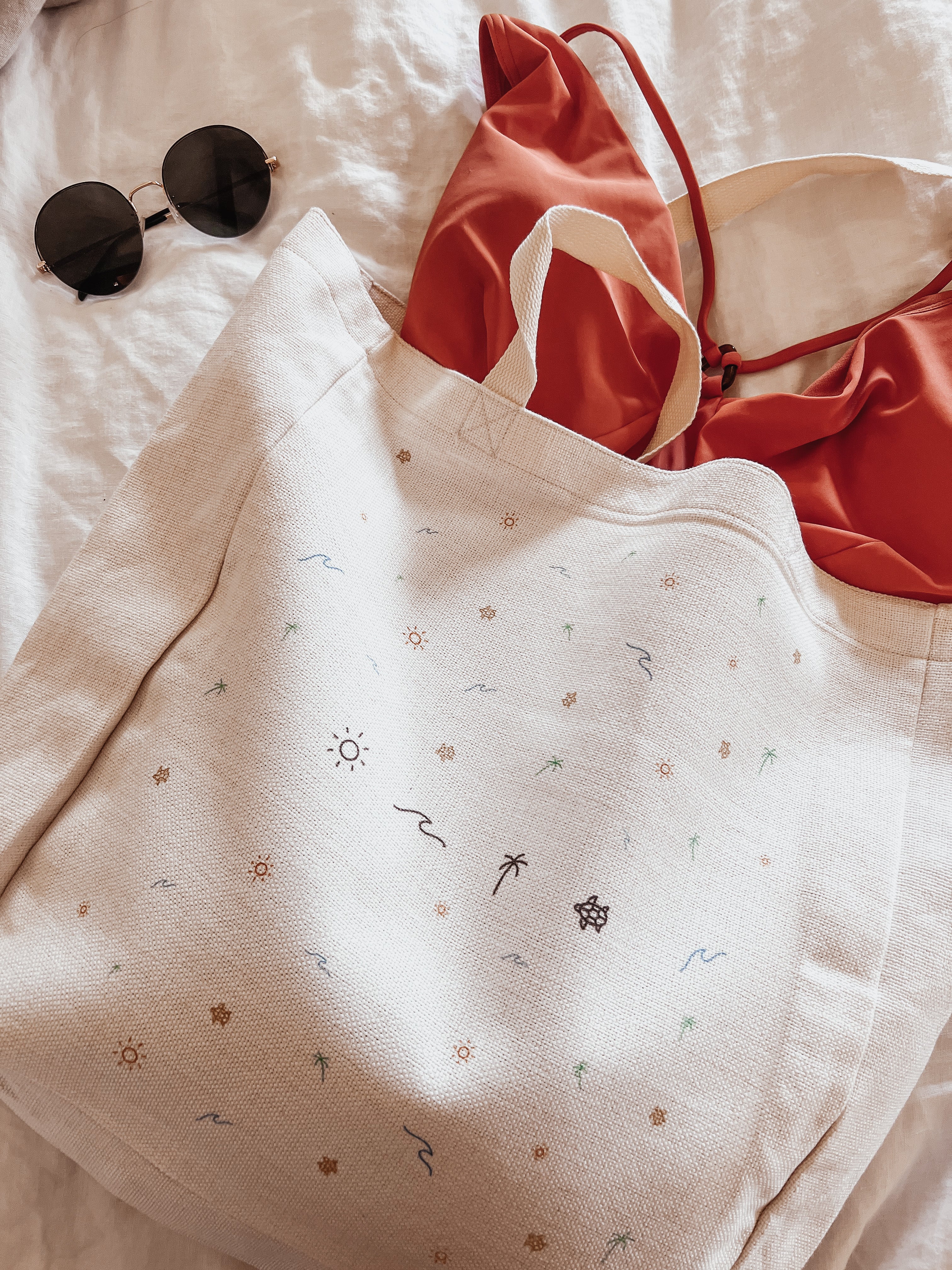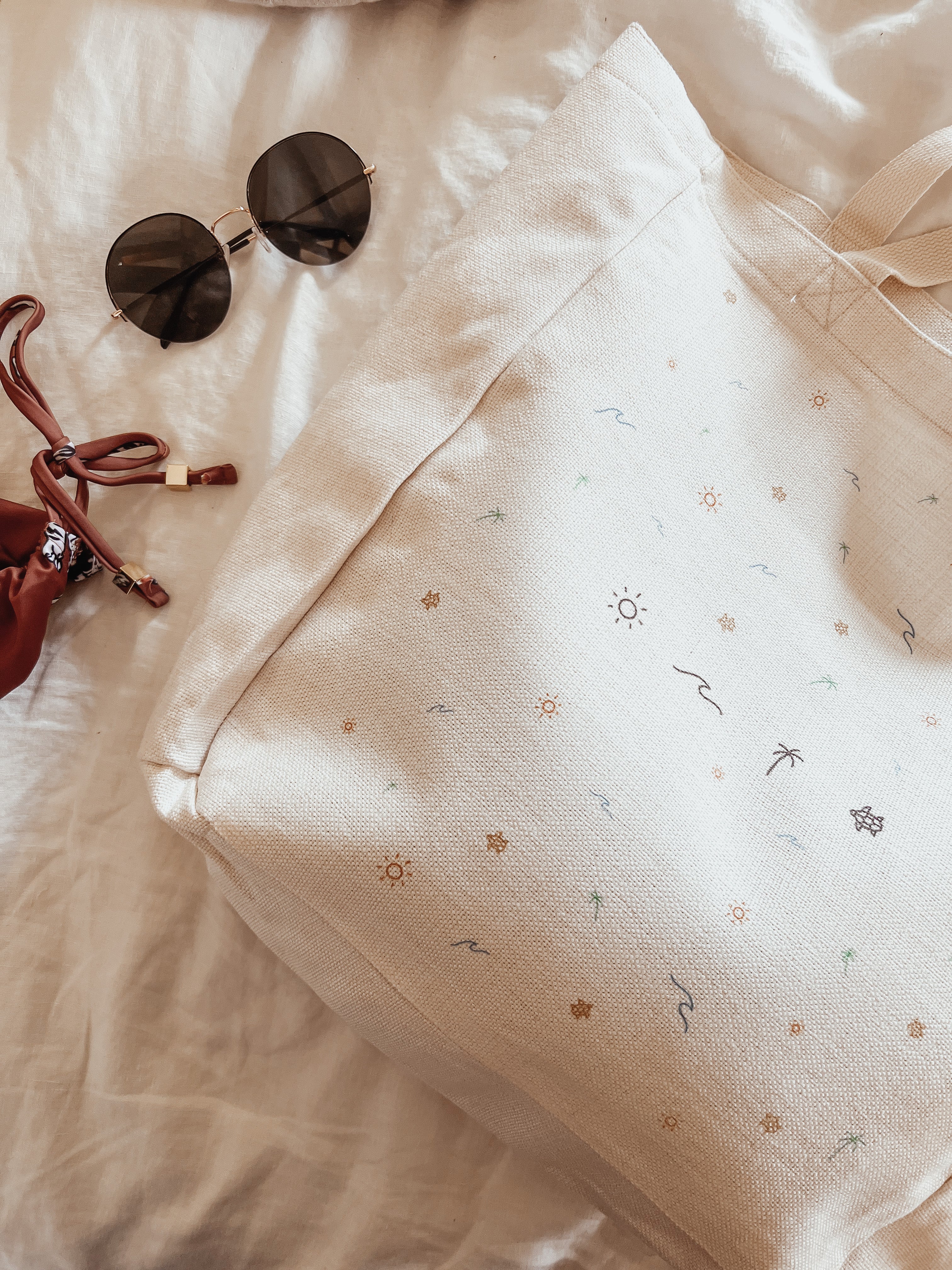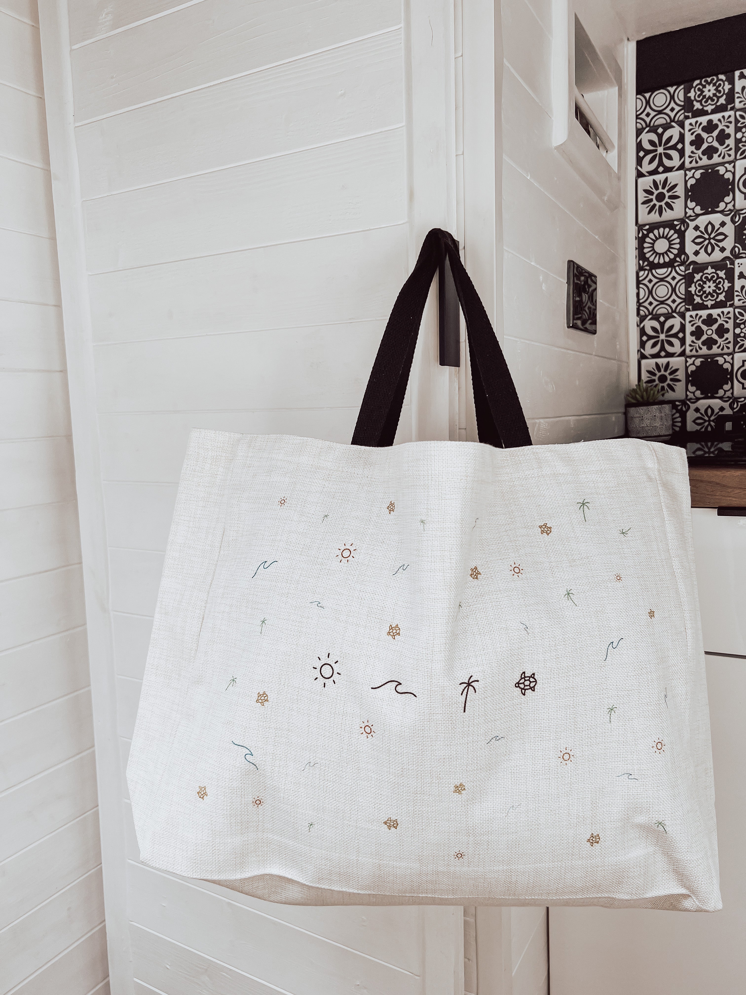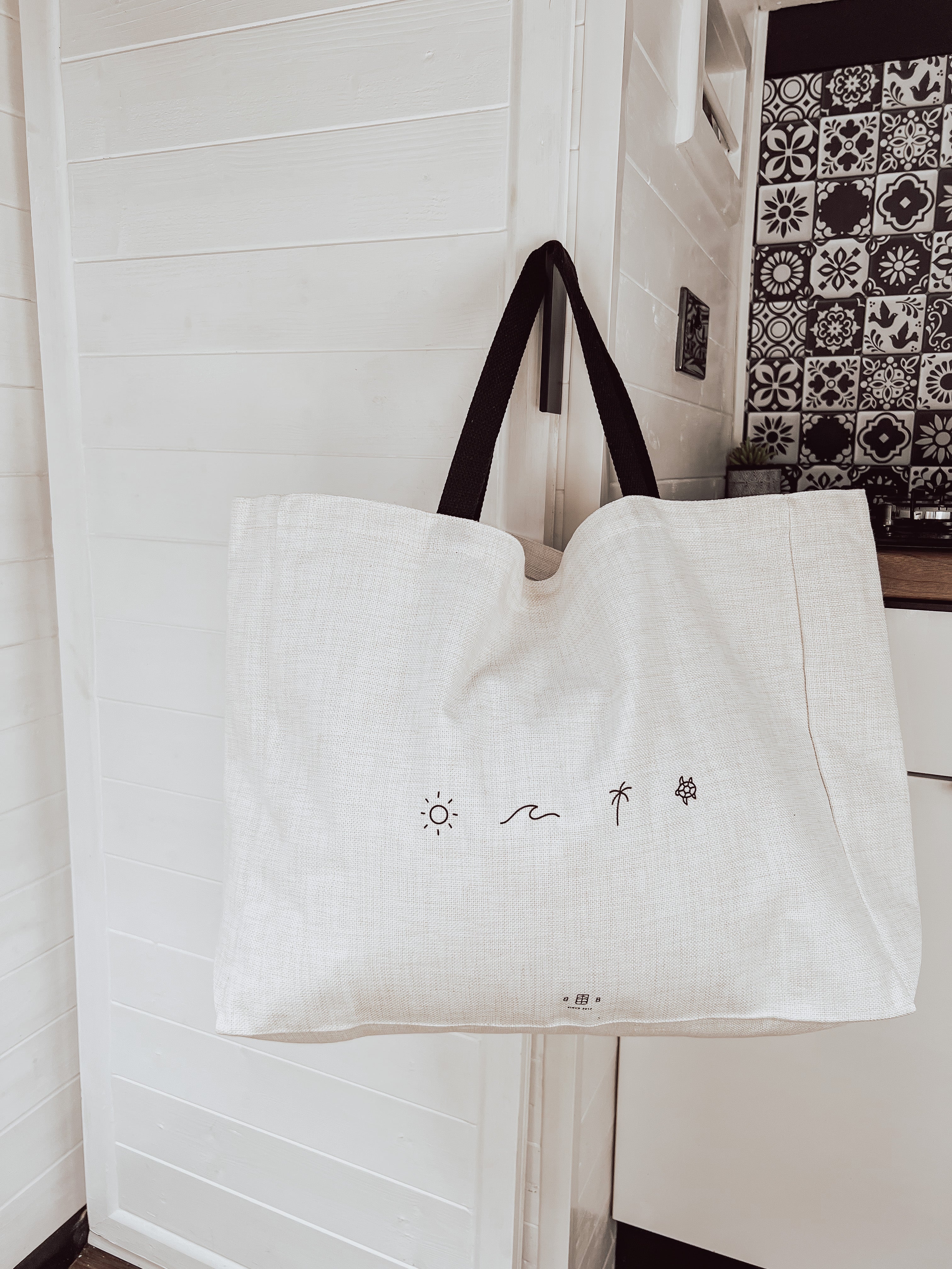 The design features minimal suns, waves, palm trees and turtles across the whole bag, in different colours and the large original design in black on the back.