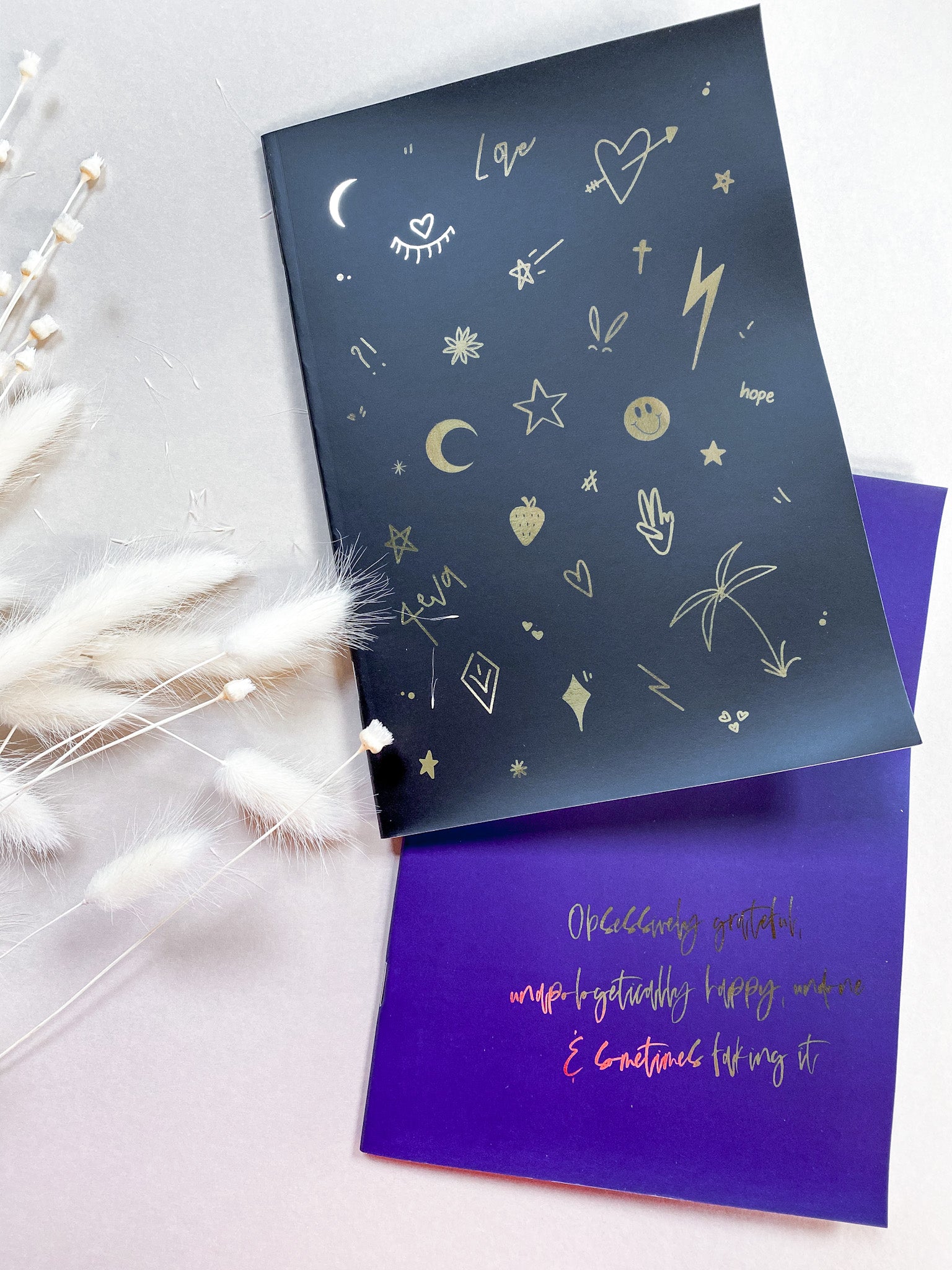 - Black Foiled Notebook; A blue (should be black) background with the words 'Obsessively grateful, unapologetically happy, undone & sometimes faking it' printed in gold foil on the front. 48 lined pages.