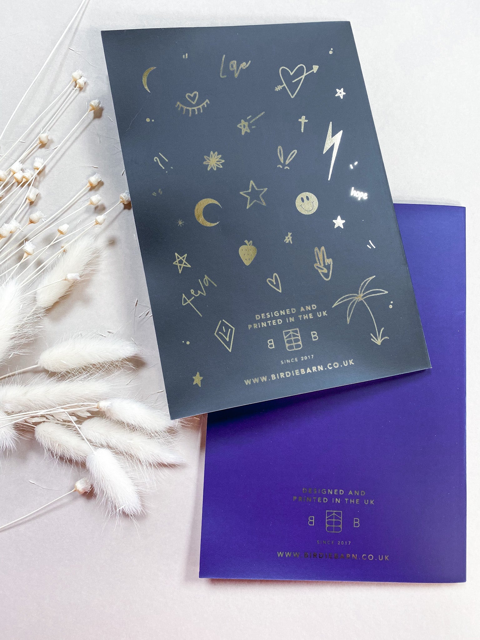 A black (should be blue) background with a fun illustration design printed in gold foil on the front and back. 48 plain pages.