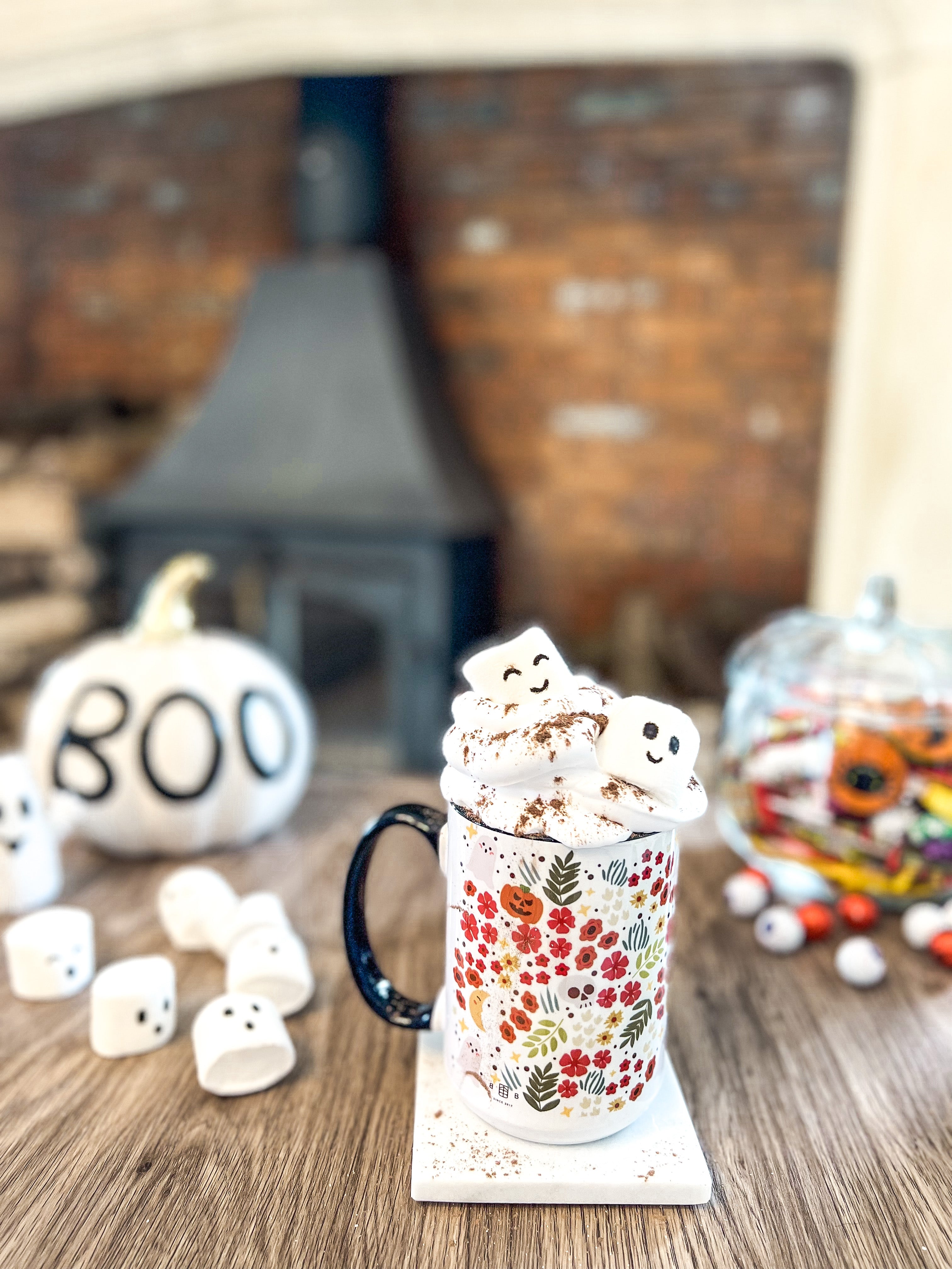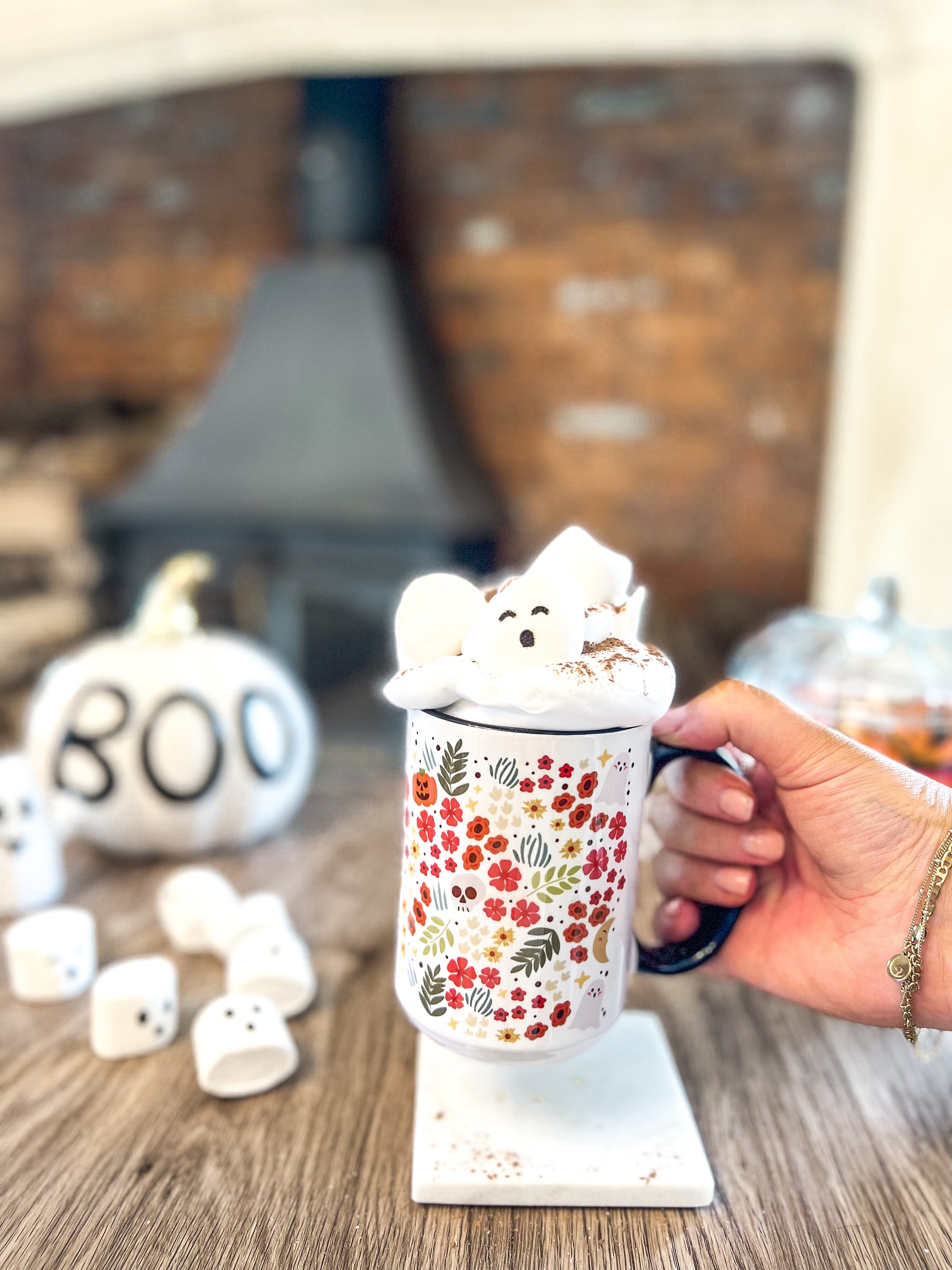 - Our hand drawn Spooky but Cute design in a seamless pattern around the entirety of the mug.